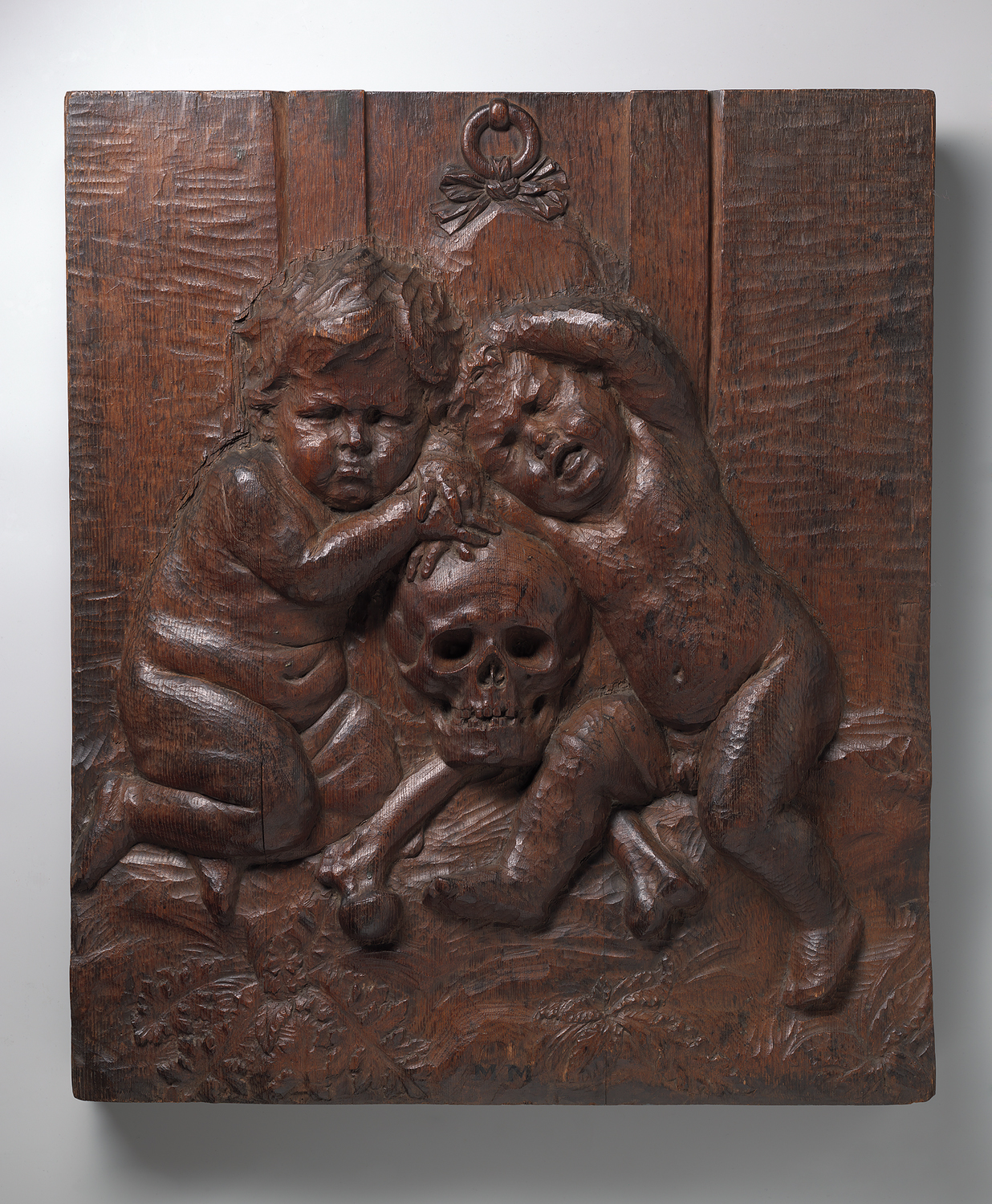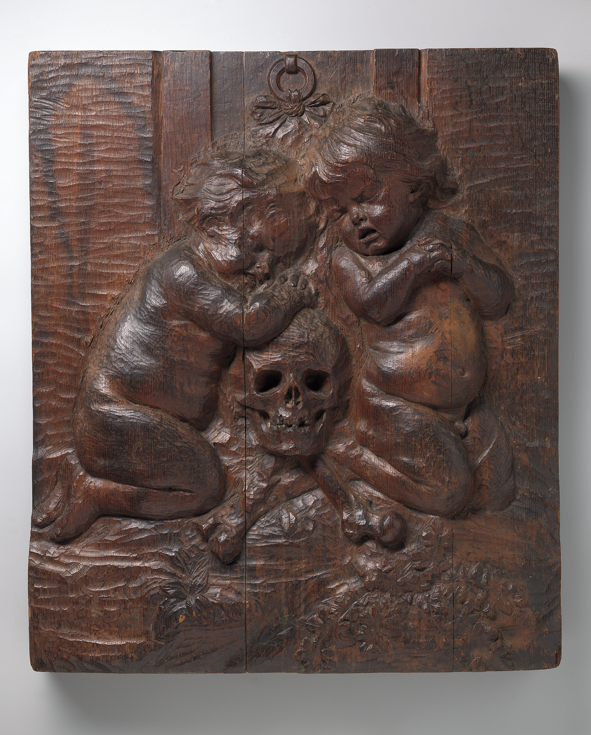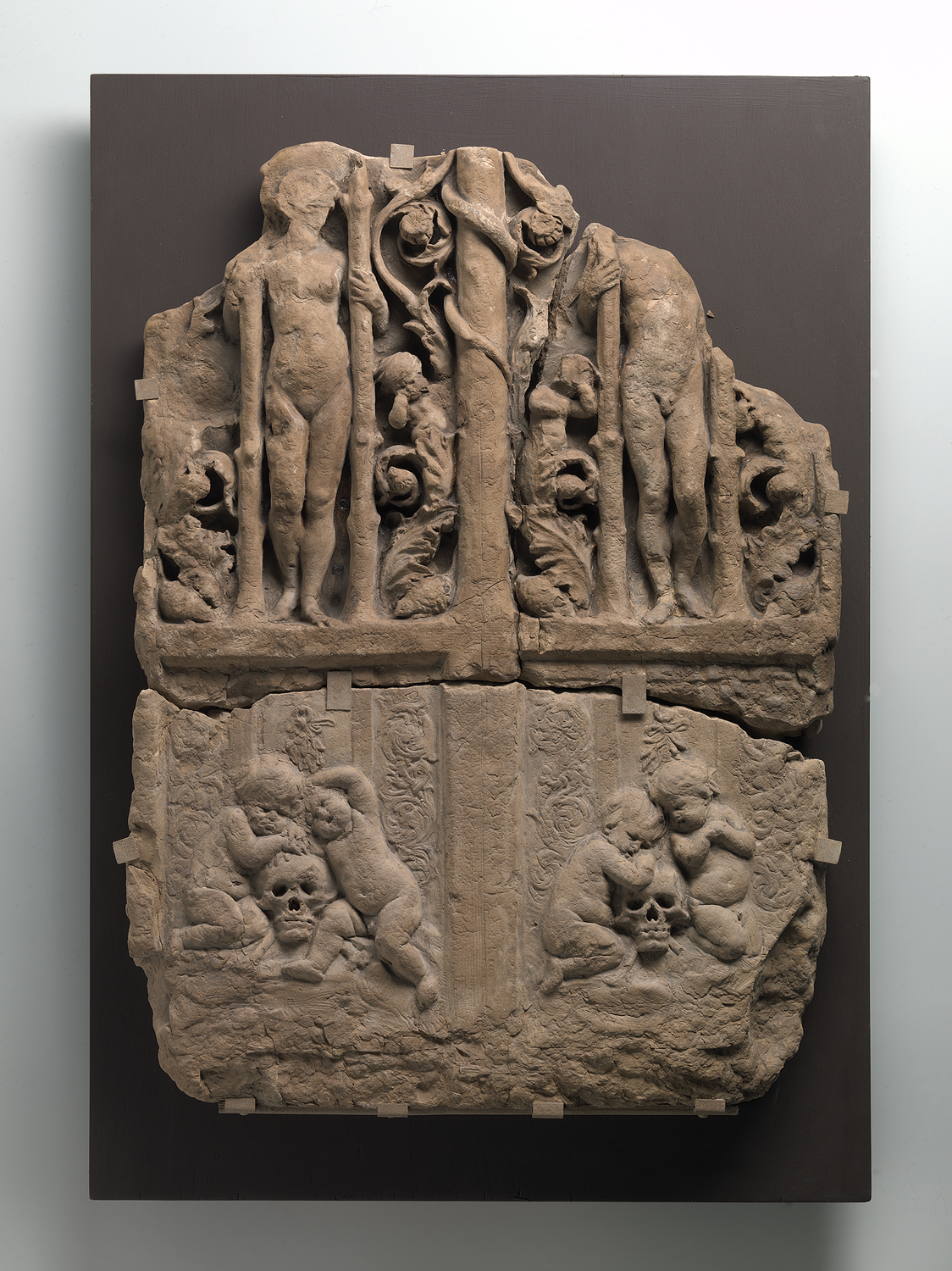Fragment linkerbeen van cartouche met weesmeisje en ...