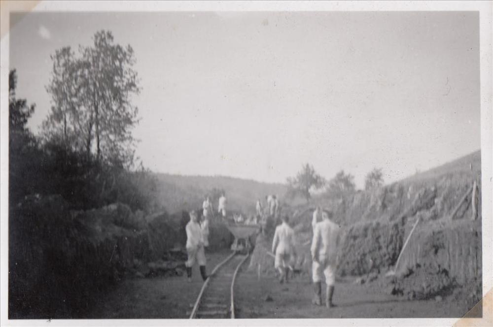 Foto van een bouwplaats met manschappen van de Reich...
