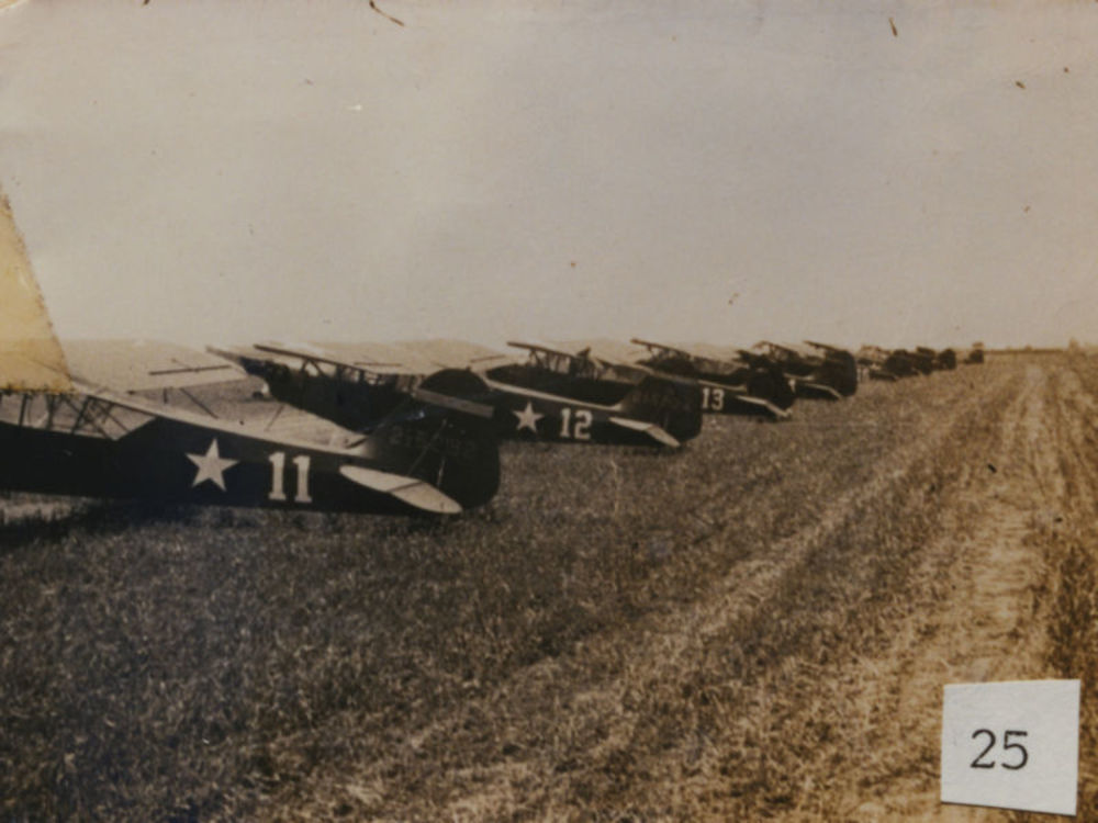 Foto van formatie van zes C-47's van de grond af gez...