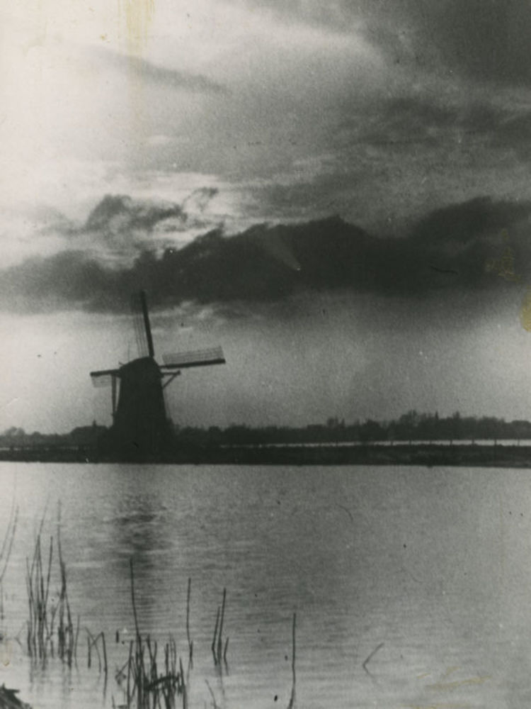 Foto van geïnundeerd weiland met molen op de achterg...