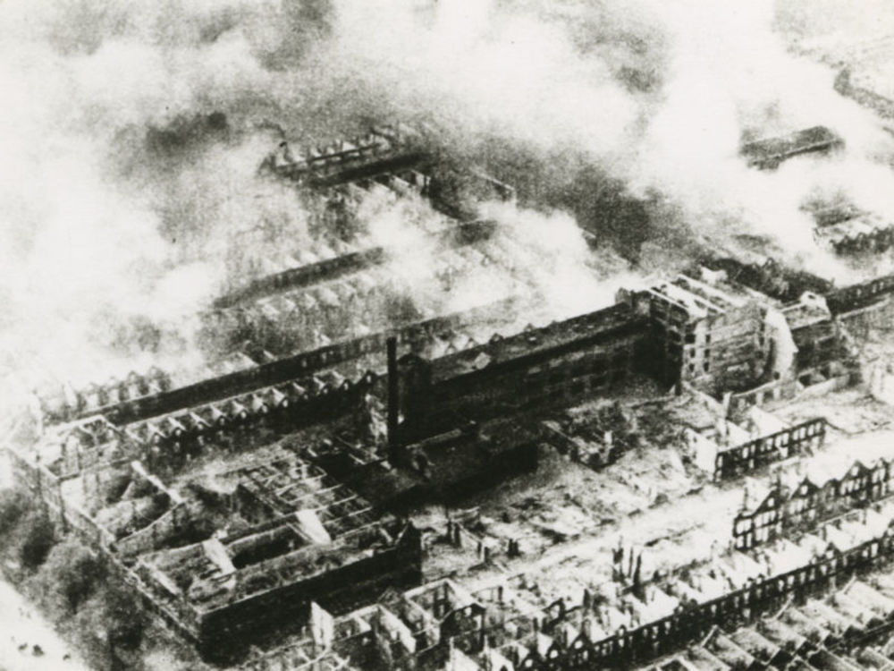 Luchtfoto uitgebrande fabriek en woonhuizen.