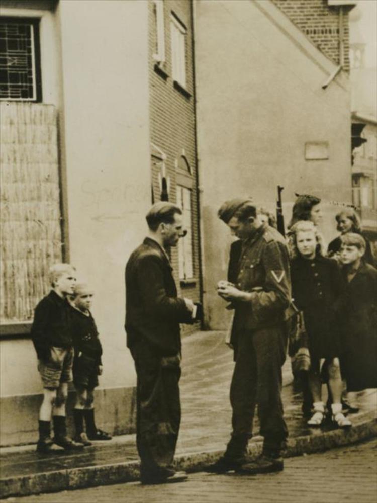 Foto van Duitse militair die in straat persoonsbewij...