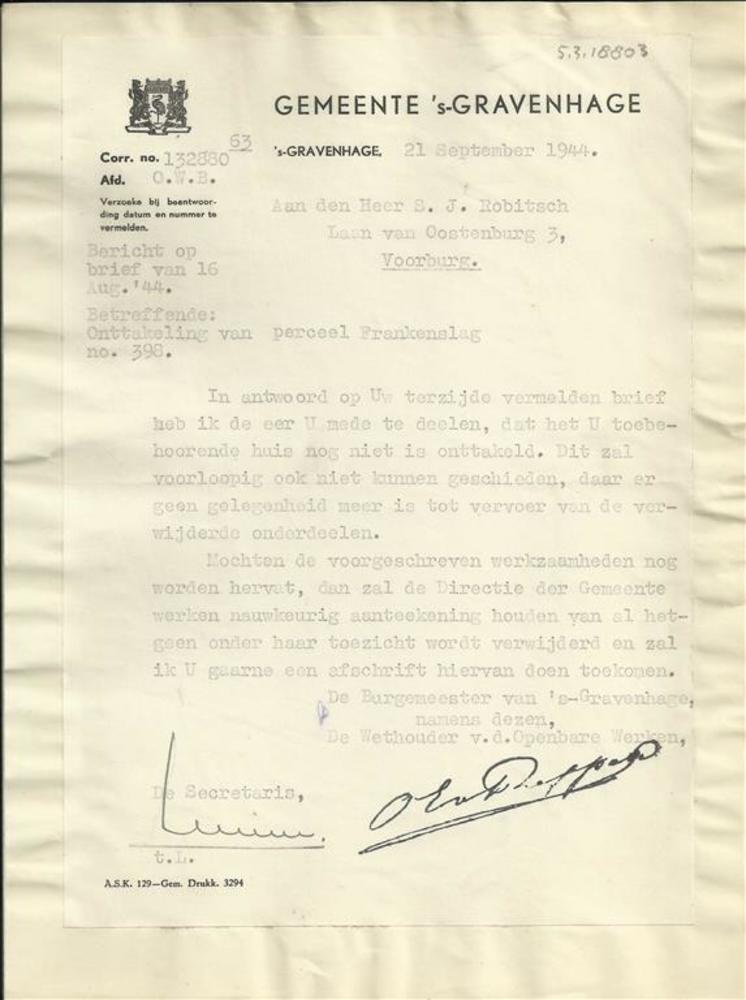 brief van gemeentebestuur 's-Gravenhage aan Dhr. Rob...