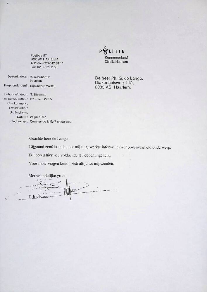 Uitreiking Commando knife 7; Wet Wapens en Munitie