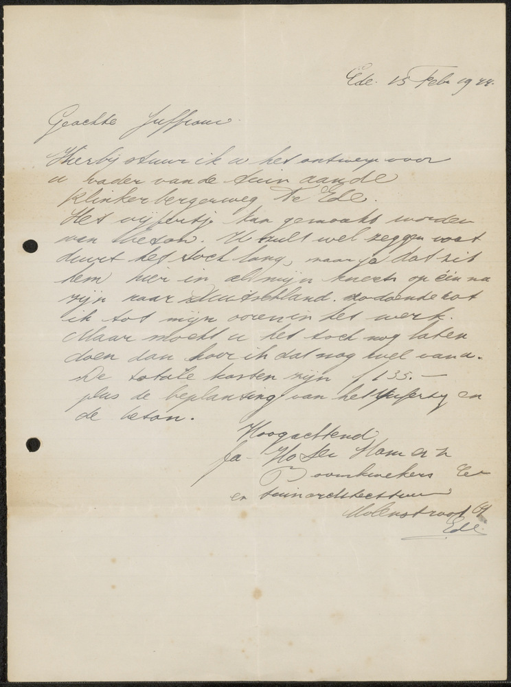 Brief 15 februari 1944 van Tuinarchitect te Ede