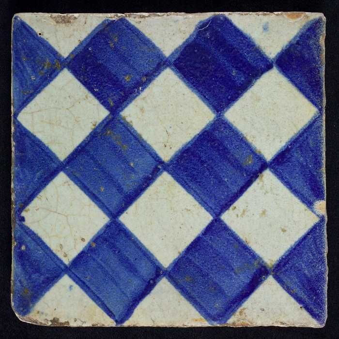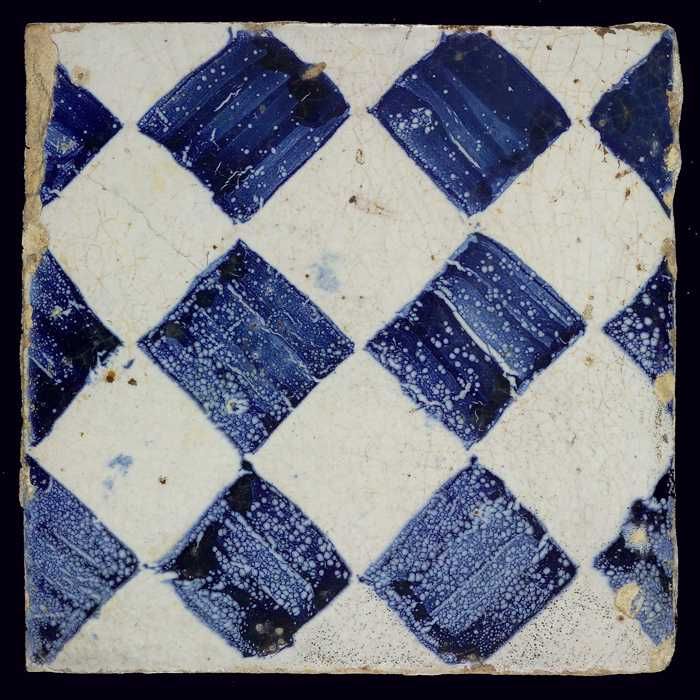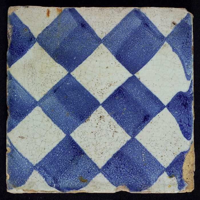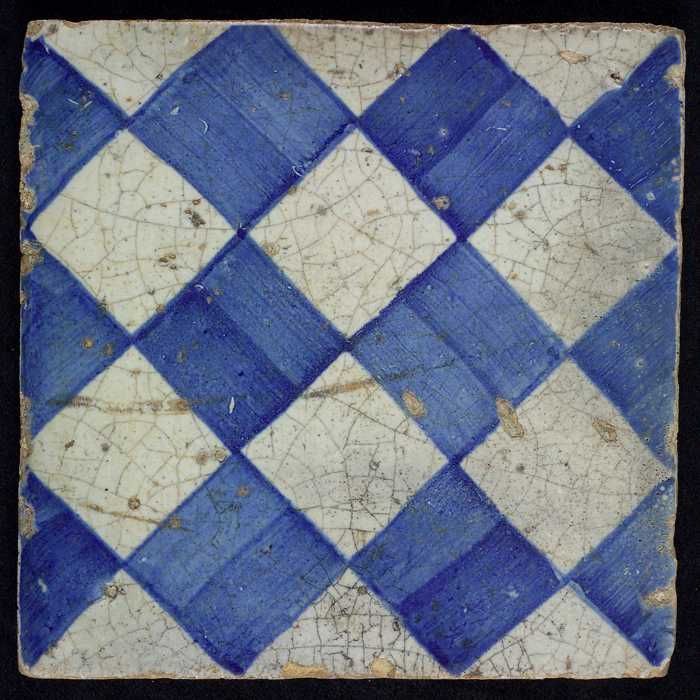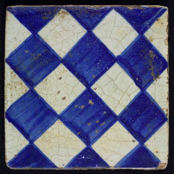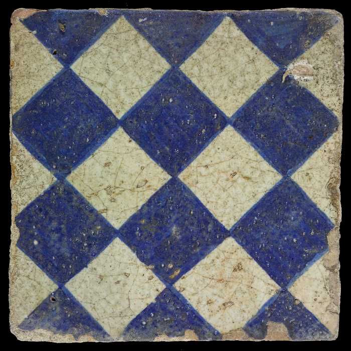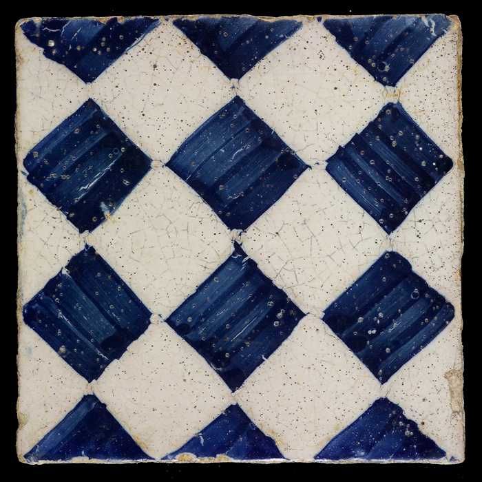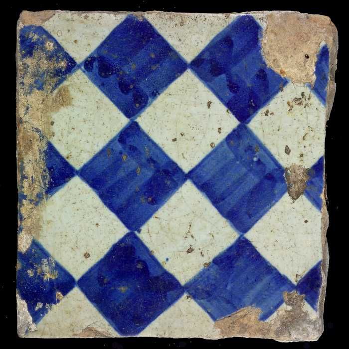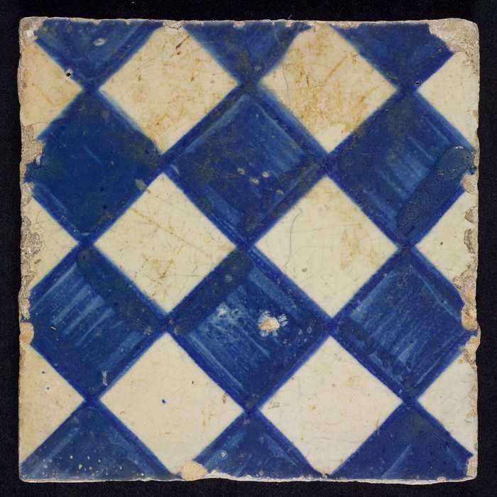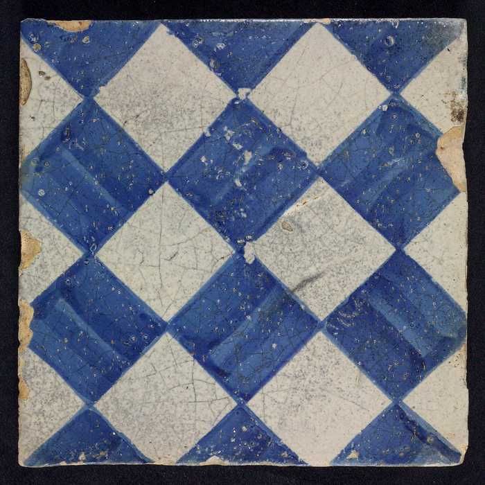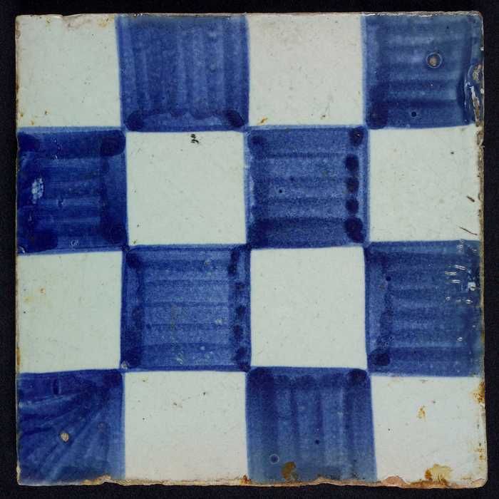 Ornamenttegel, blauw op wit, centraal decor, dambord...
