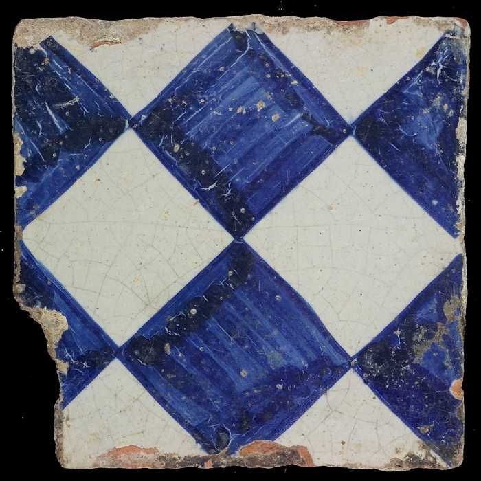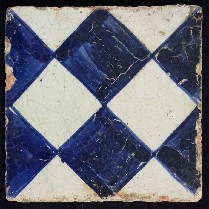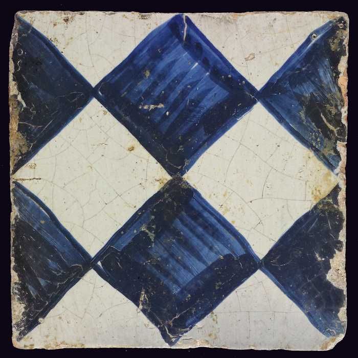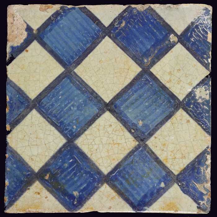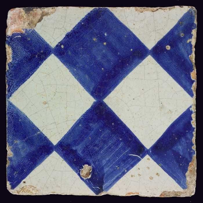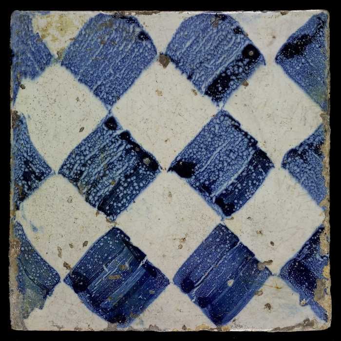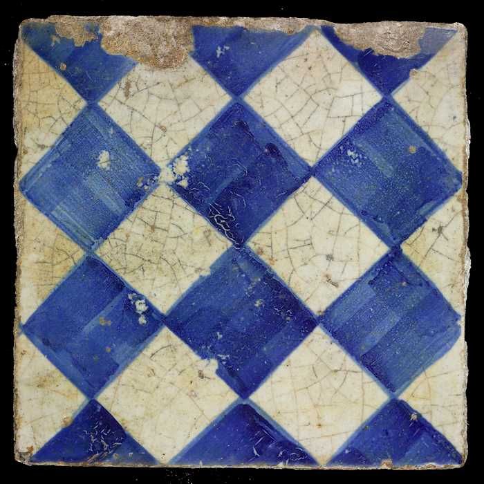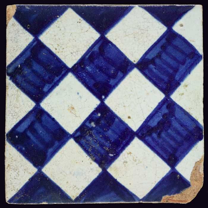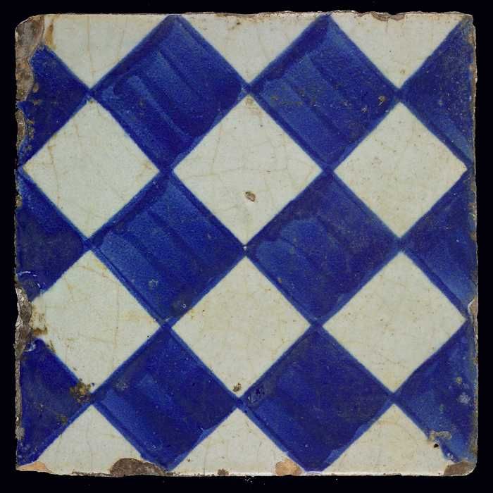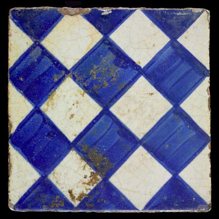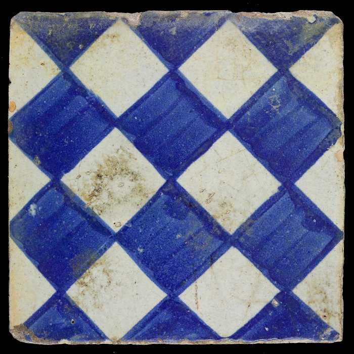 Ornamenttegel, blauw op wit, centraal decor, dambord...