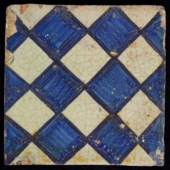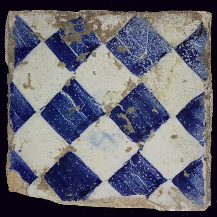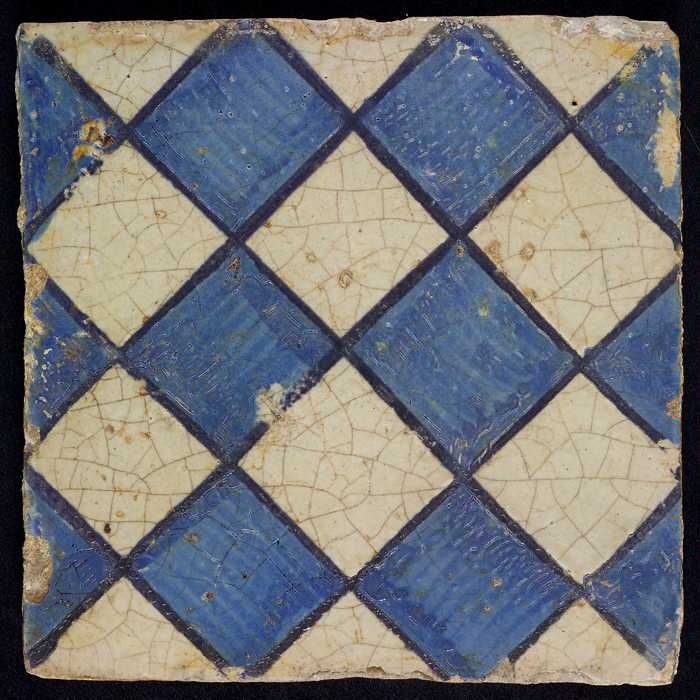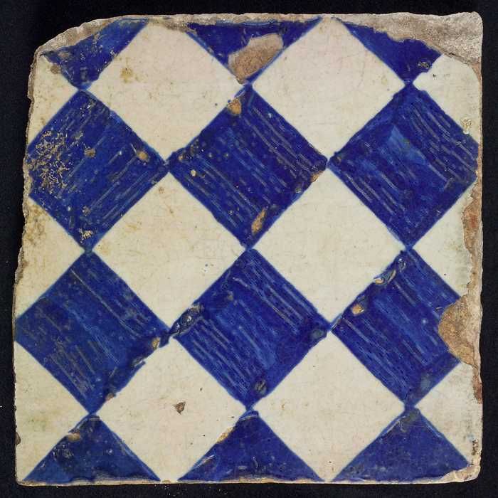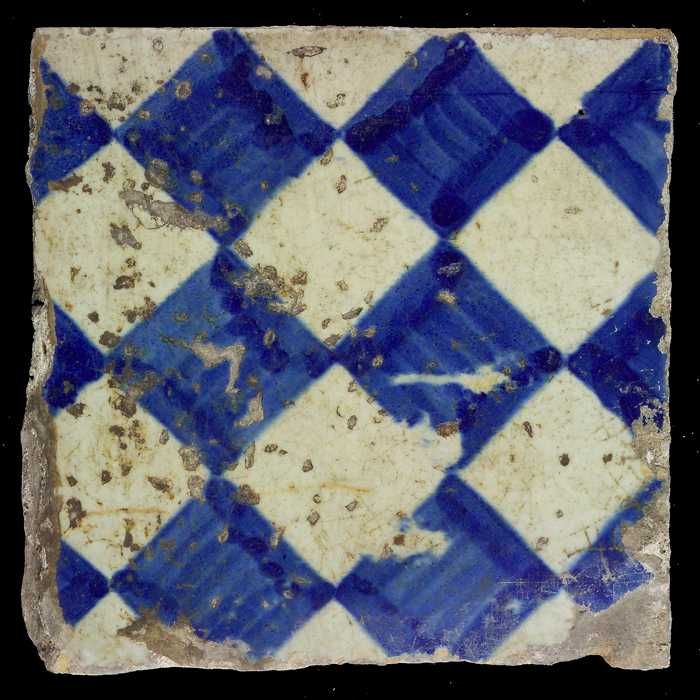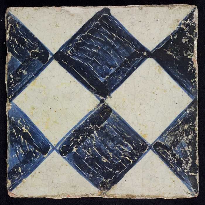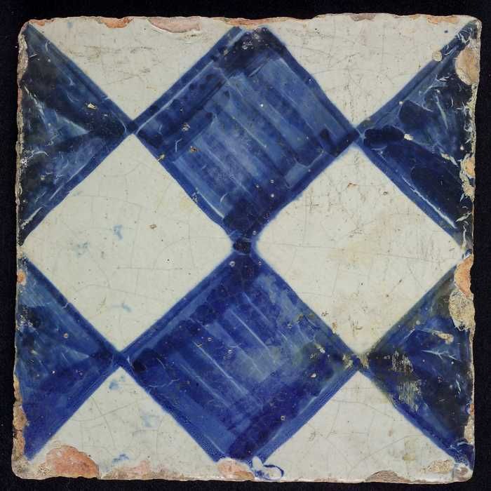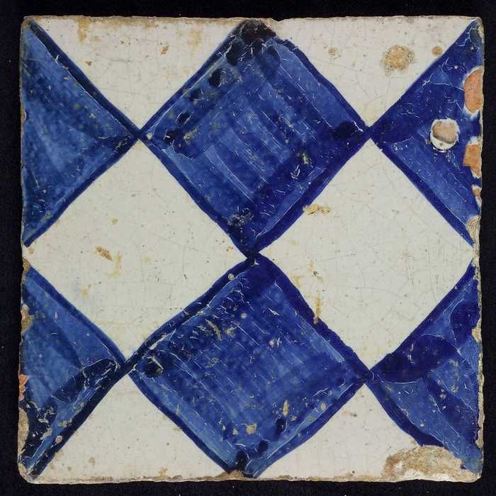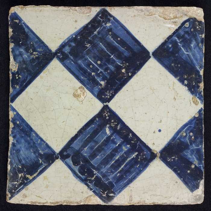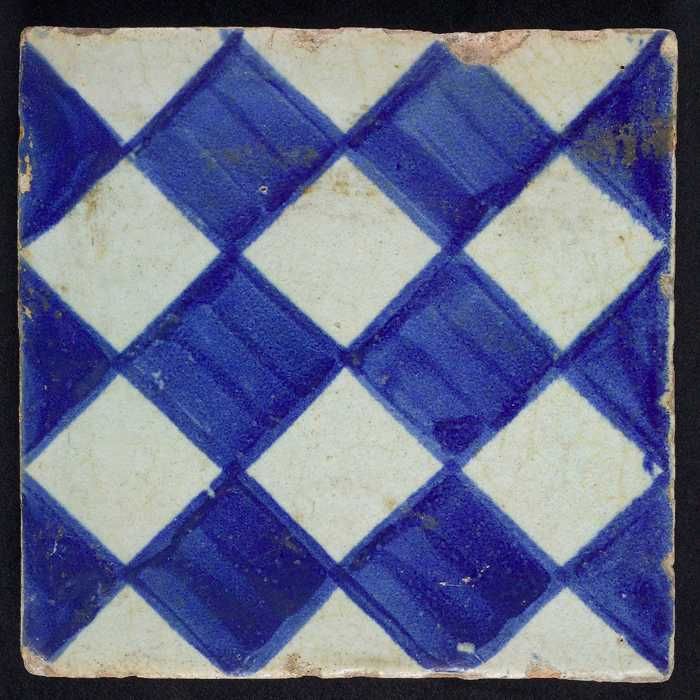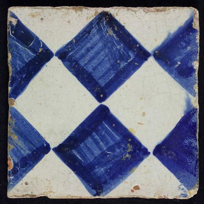 Ornamenttegel, blauw op wit, centraal decor, dambord...
