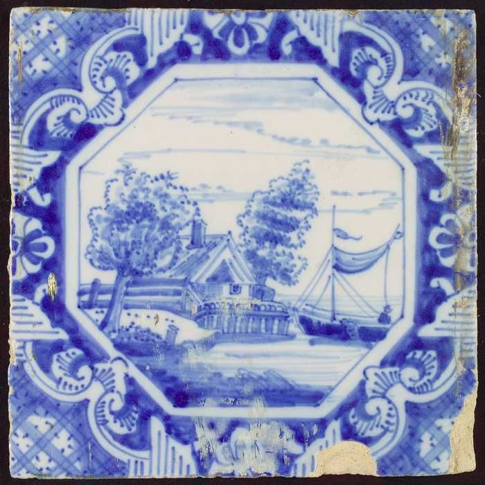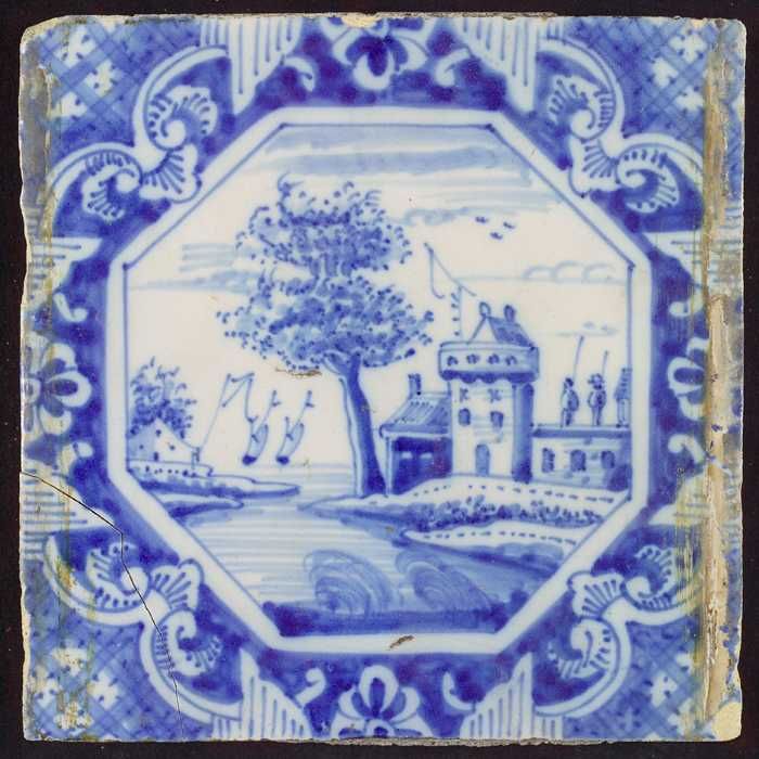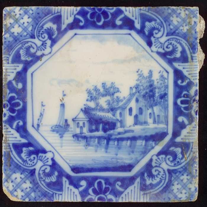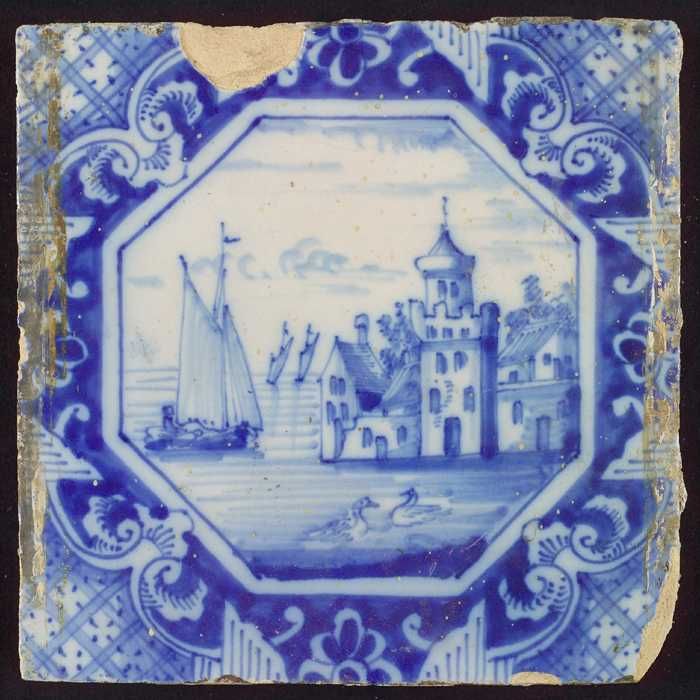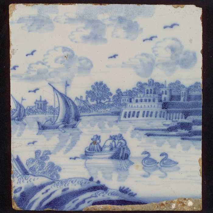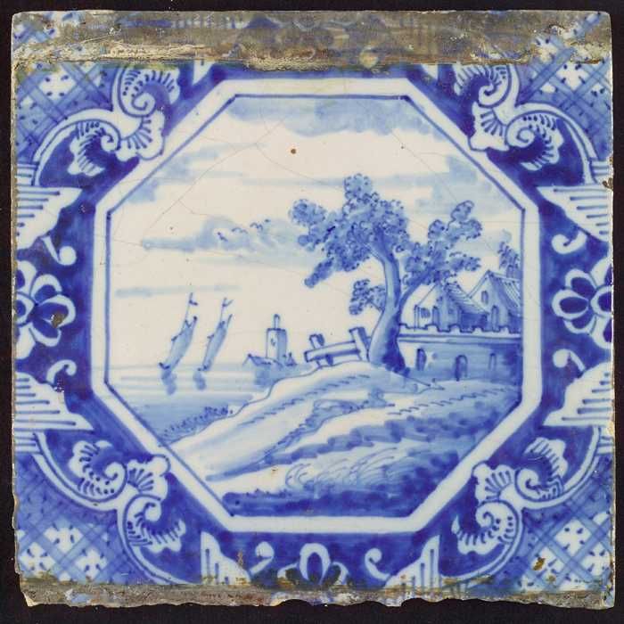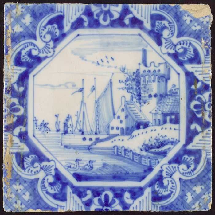 Tafereeltegel, landschap, huizen en zeilschepen, in ...