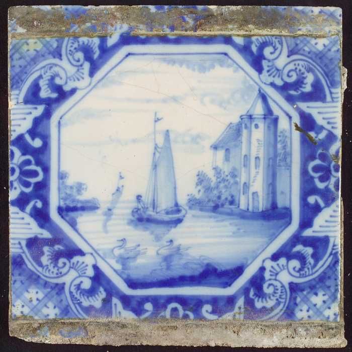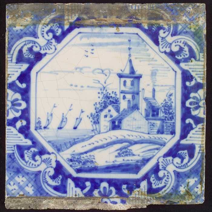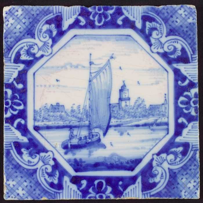 Tafereeltegel, landschap, toren, huizen en zeilschep...