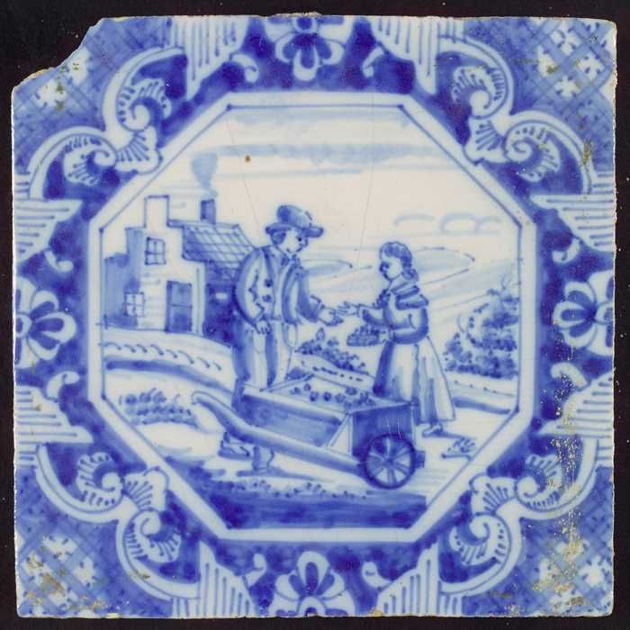 Tafereeltegel, landschap, man en vrouw met kruiwagen...