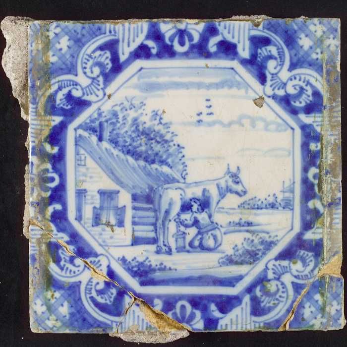 Tafereeltegel, landschap, vrouw melkt koe, in het lof