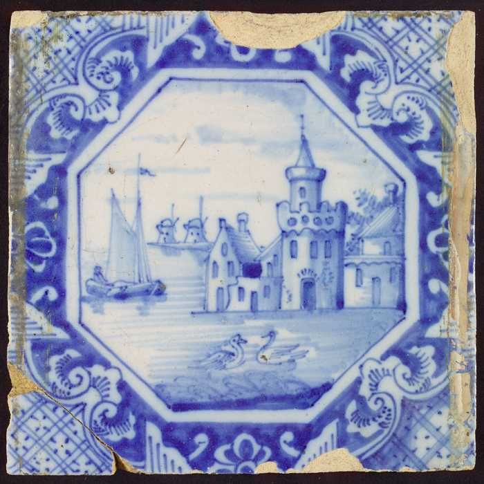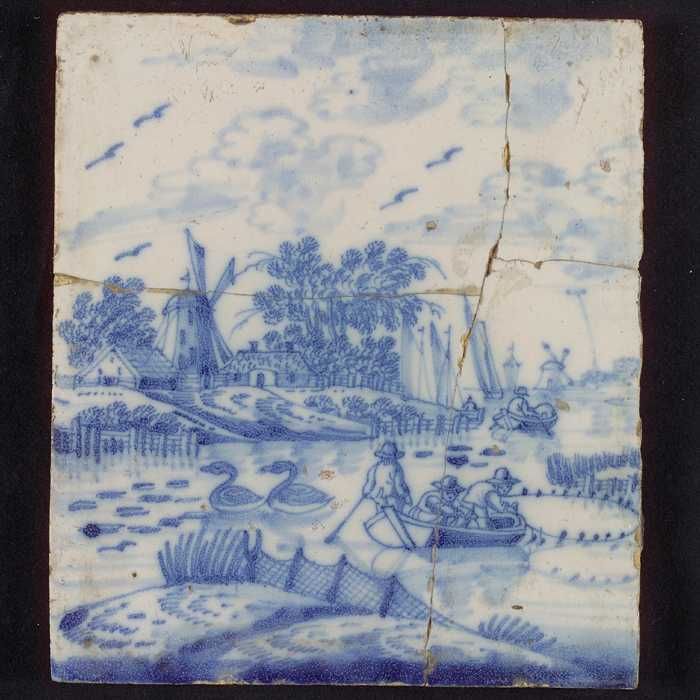 Tegel, blauw op wit, openluchtje, sloot met zwanen w...
