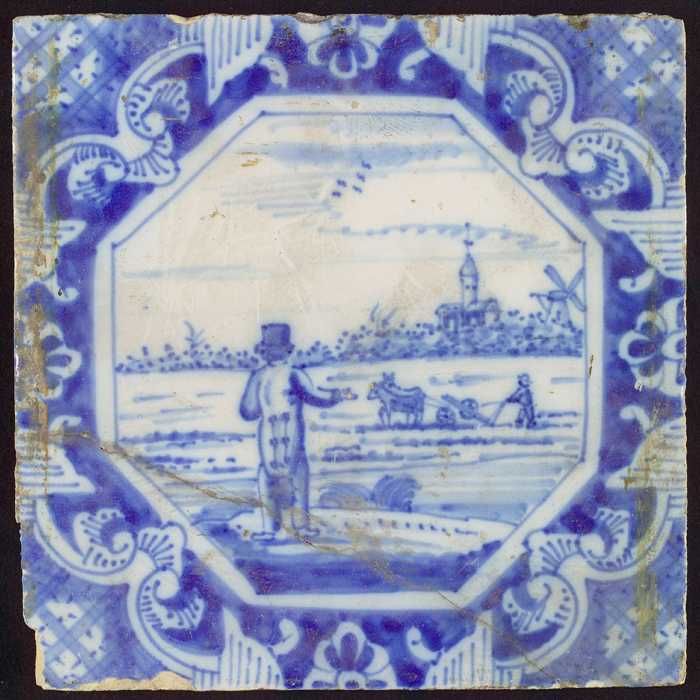 Tafereeltegel, landschap, platbodem met man, in het lof