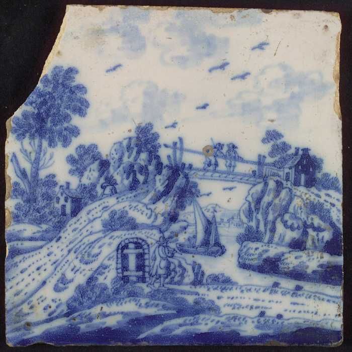 Tafereeltegel, landschap, boerderij en man op brug, ...
