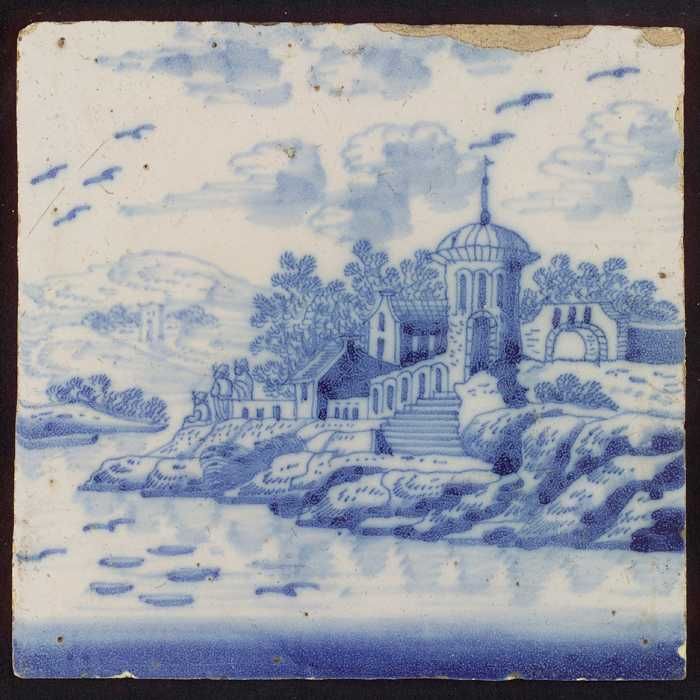 Tafereeltegel, landschap, kademuur met kerk, huizen,...