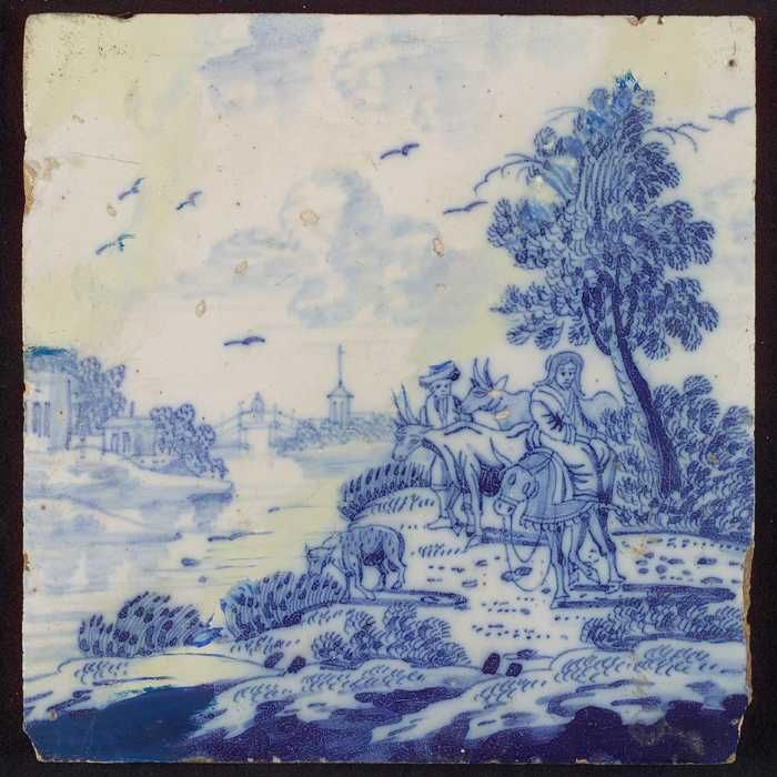 Tafereeltegel, vrouw zit op ezel, man staat
