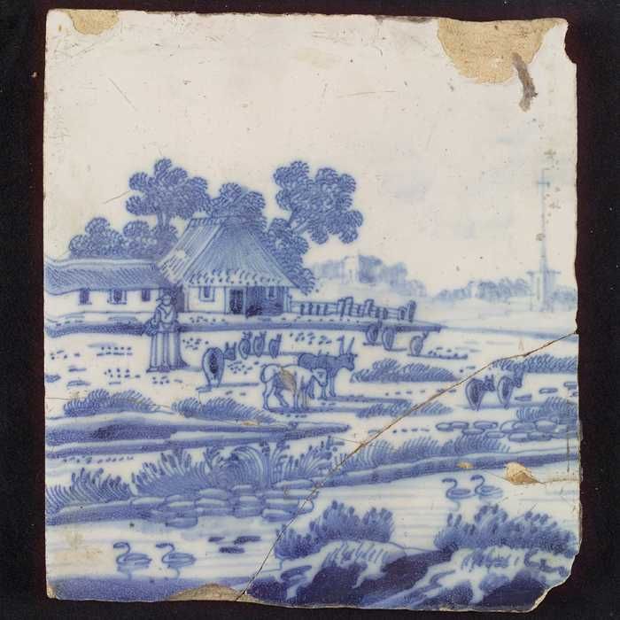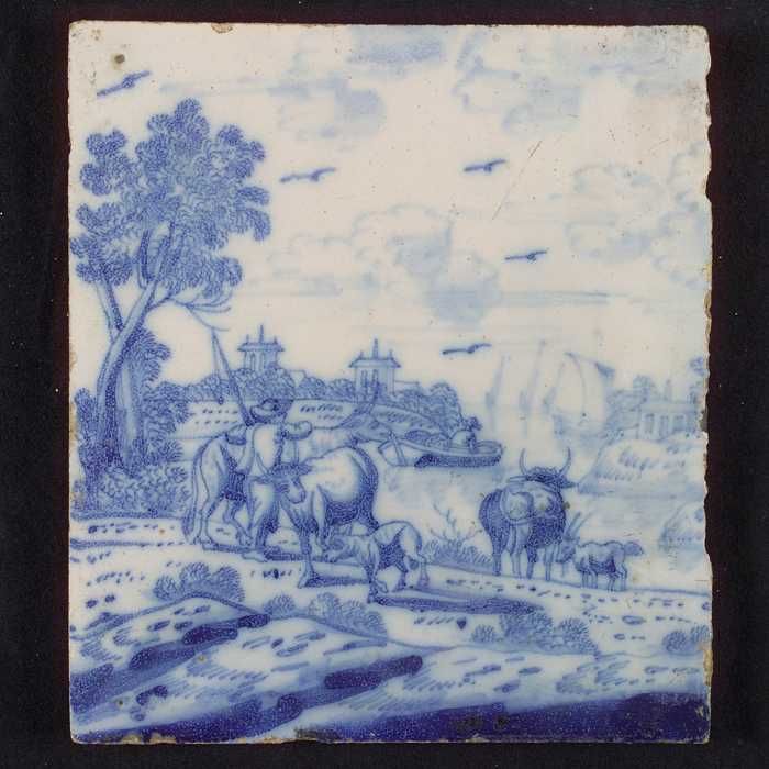 Tegel, blauw op wit, openluchtje, man bij drie koeie...