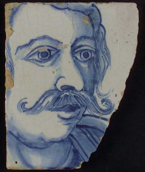 Tegel met blauw portret van man met snor, Gaius Muci...