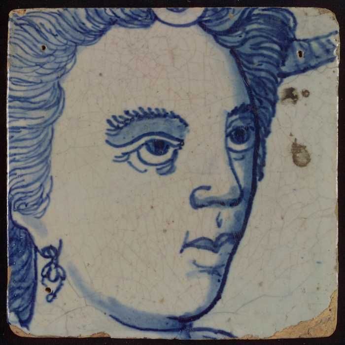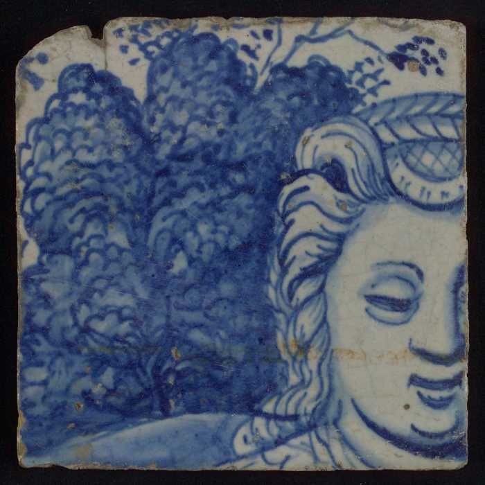 Tegel met in blauw deel van hoofd en veer