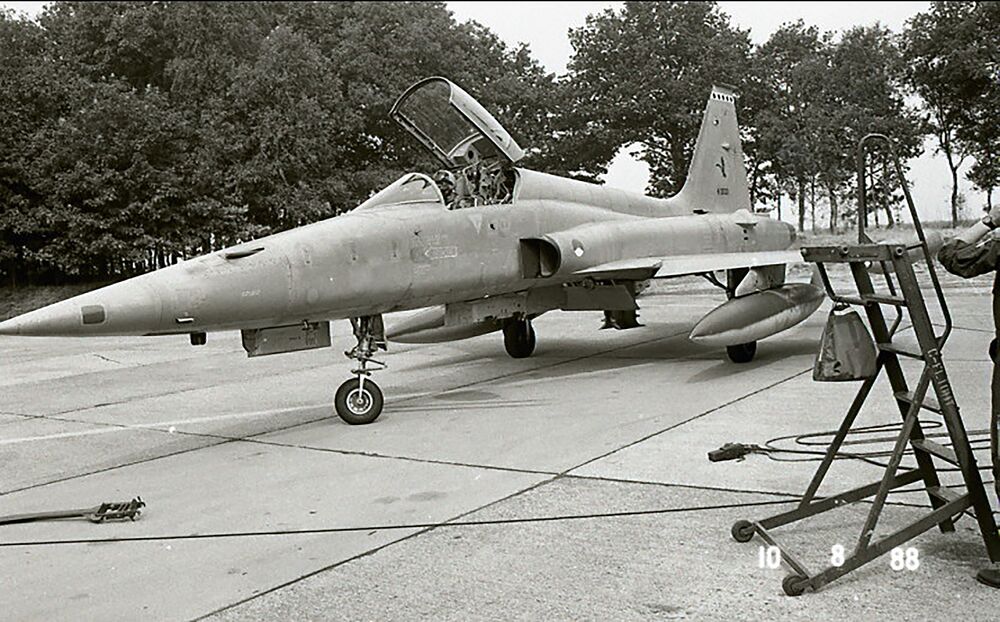 De Northrop NF5A voor de shelter, aan boord Lt.Kol.v...