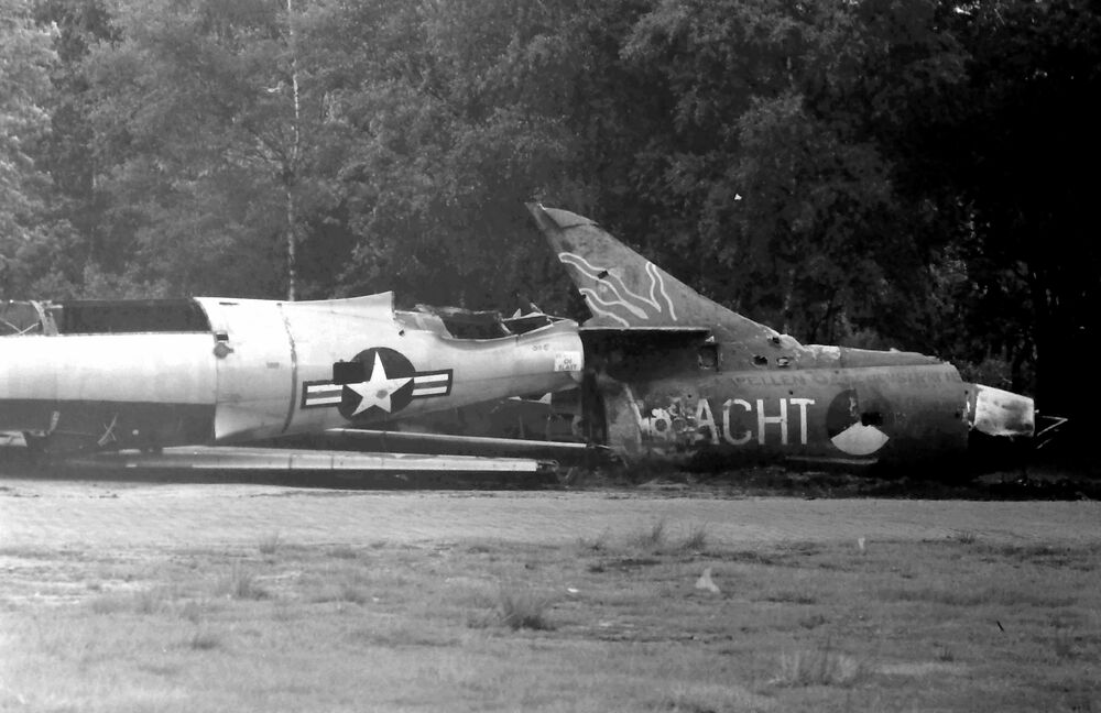 Rechts Hawker Hunter staartdeel KLu, wrak.