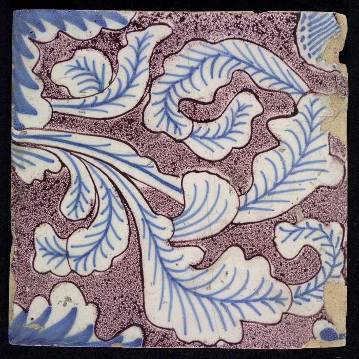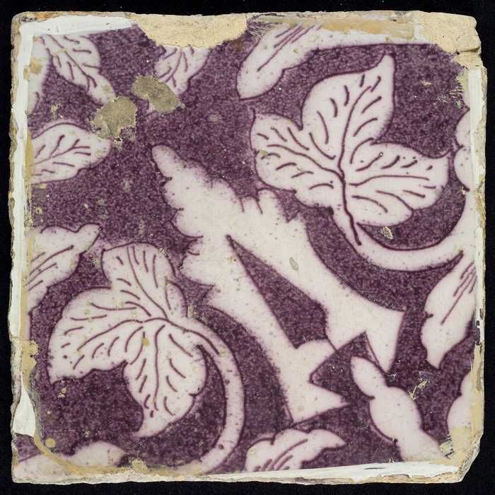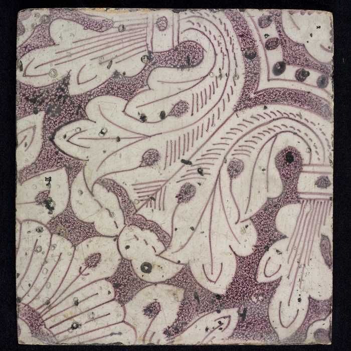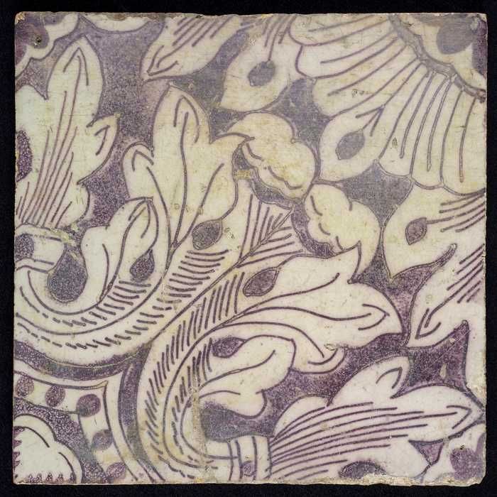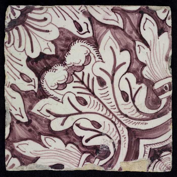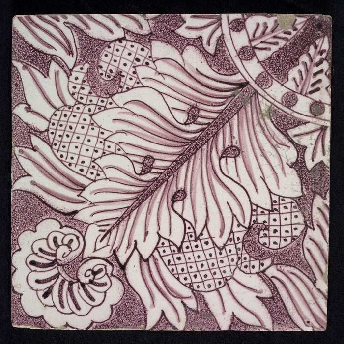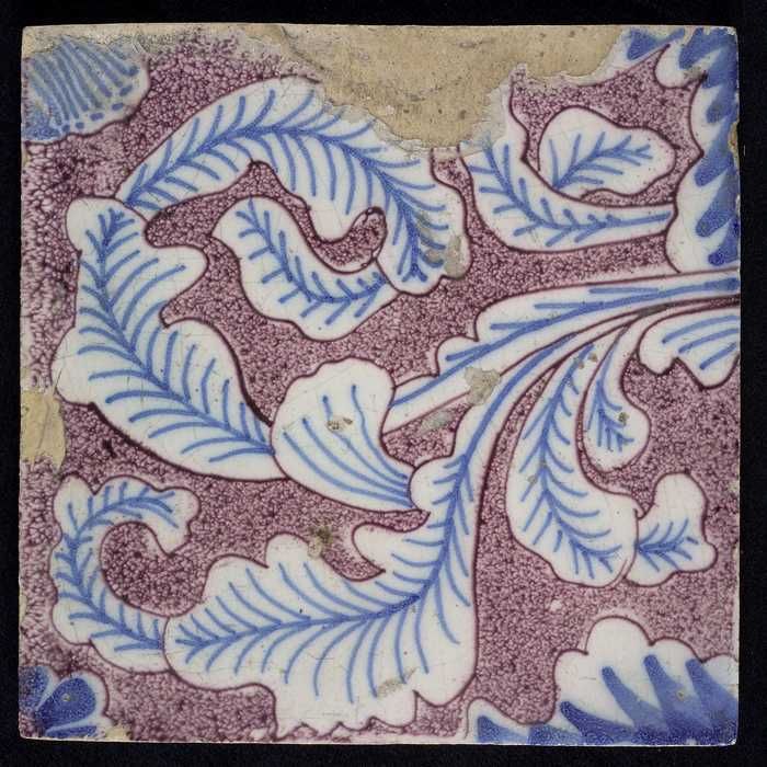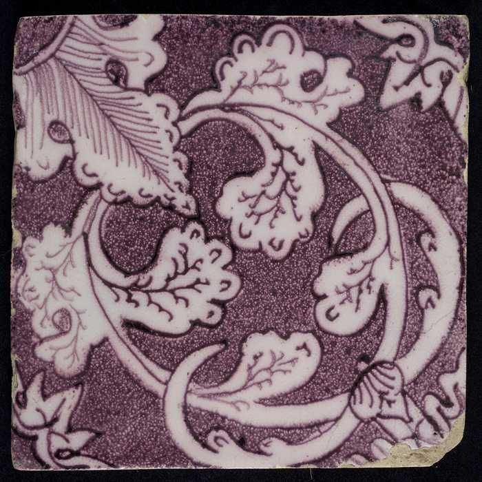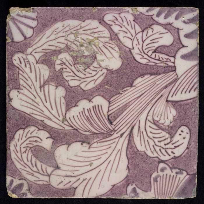 Ornamenttegel, paars op wit, acanthusblad en bloembl...