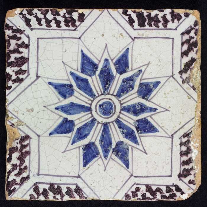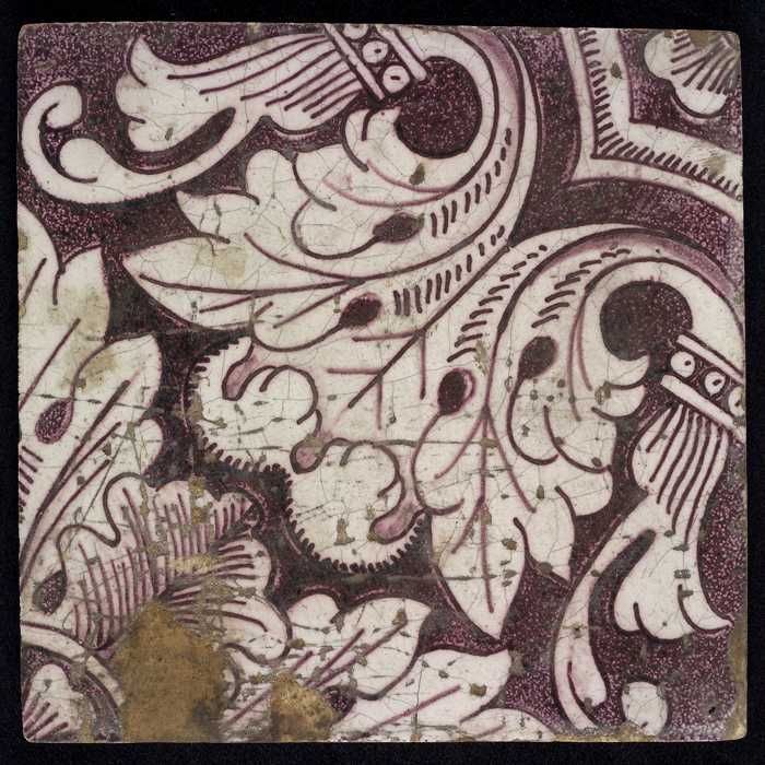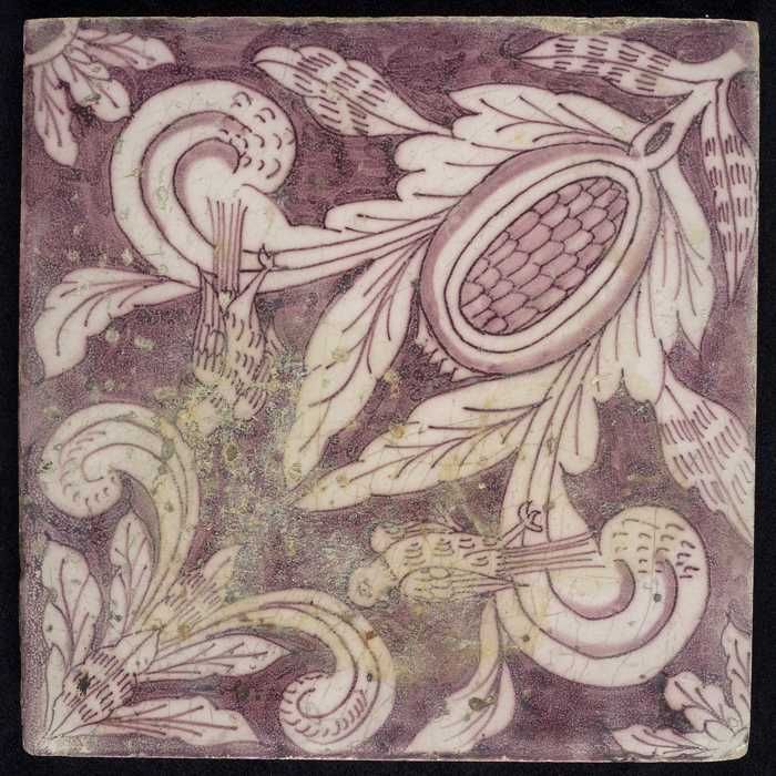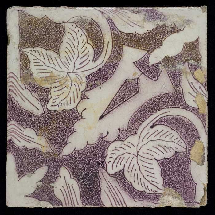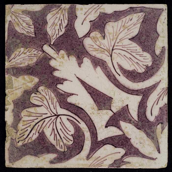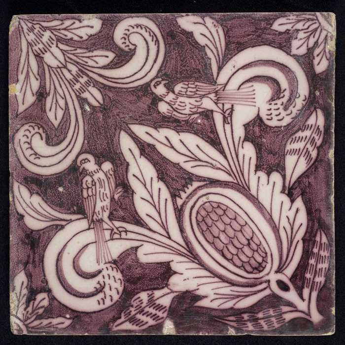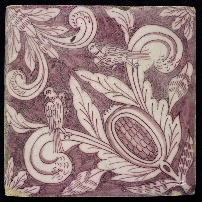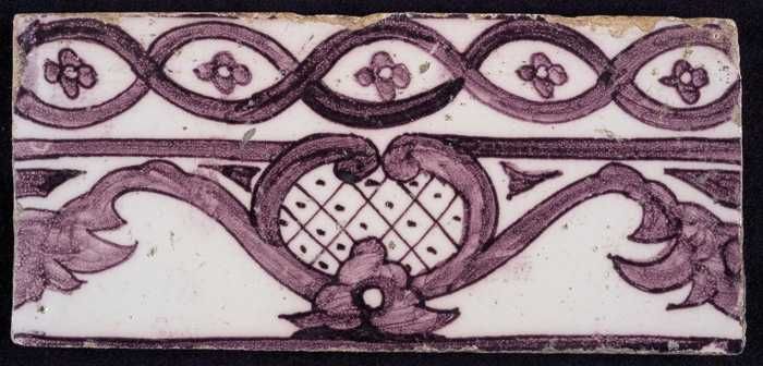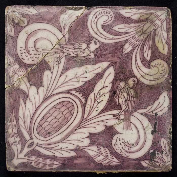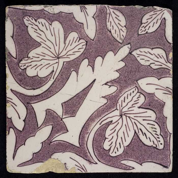 Ornamenttegel, paars op wit, acanthusblad en bloembl...