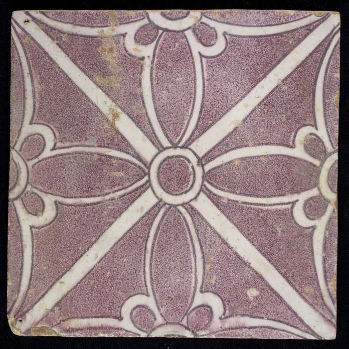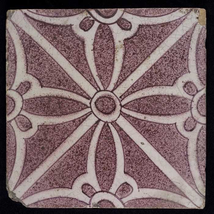 Ornamenttegel, paars op wit, centraal decor, klein d...