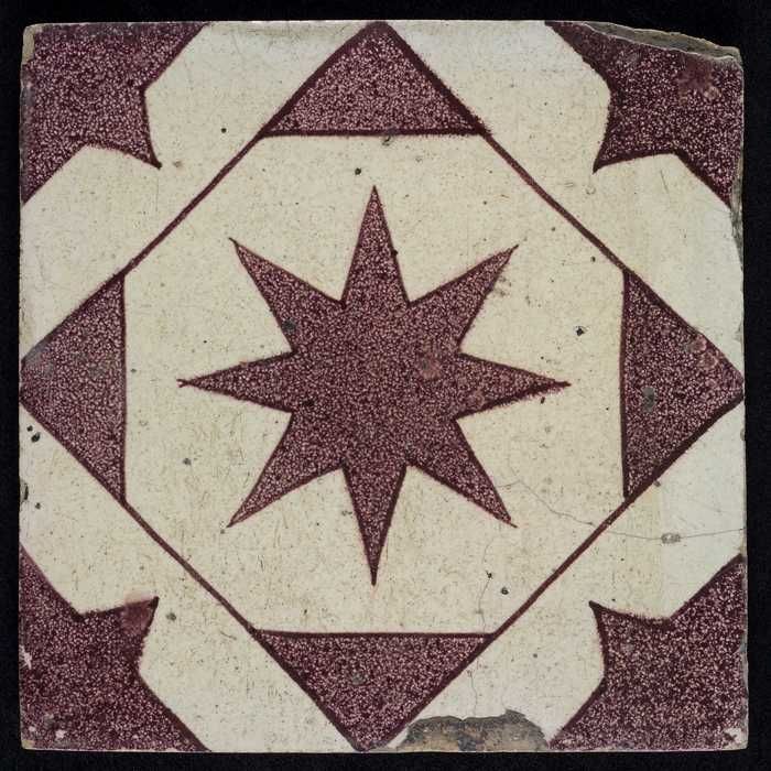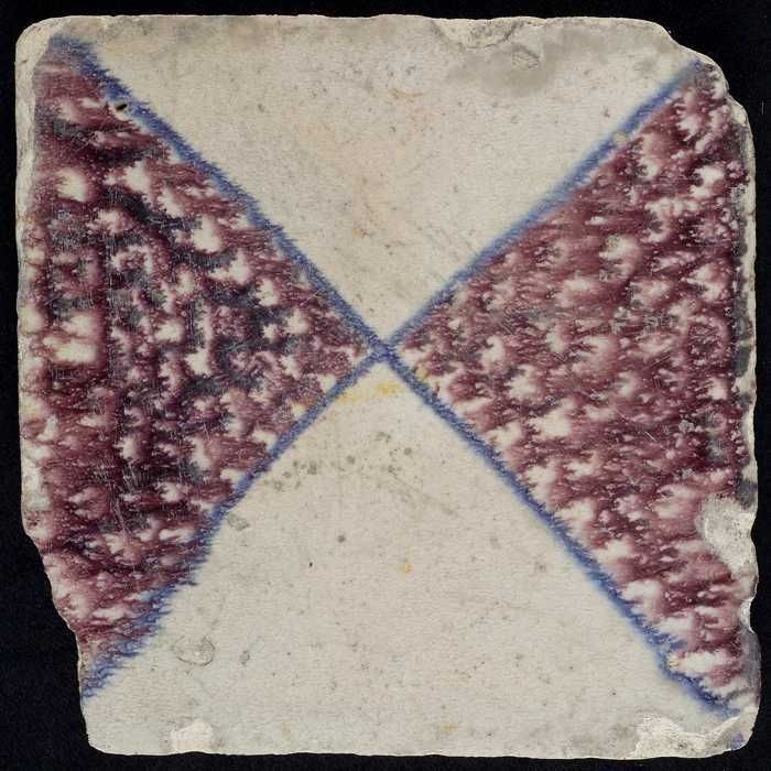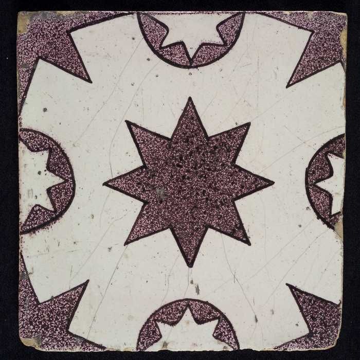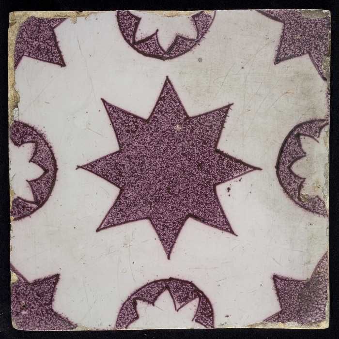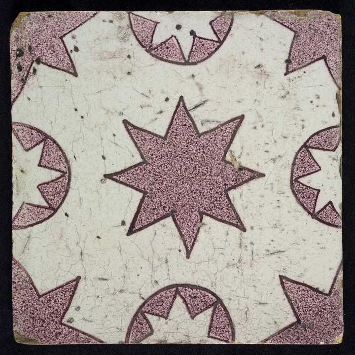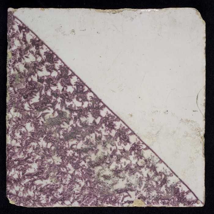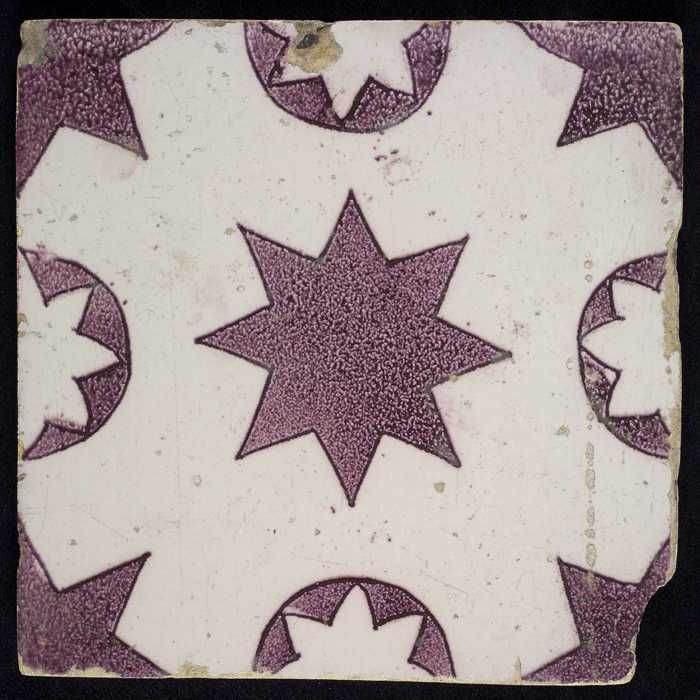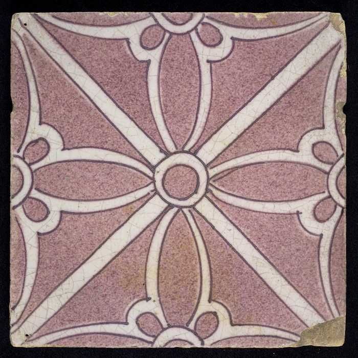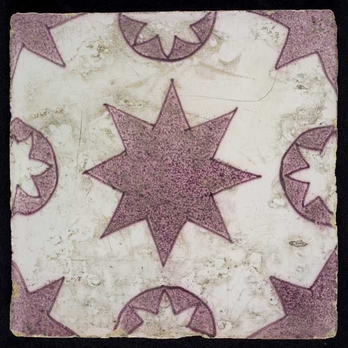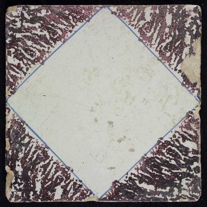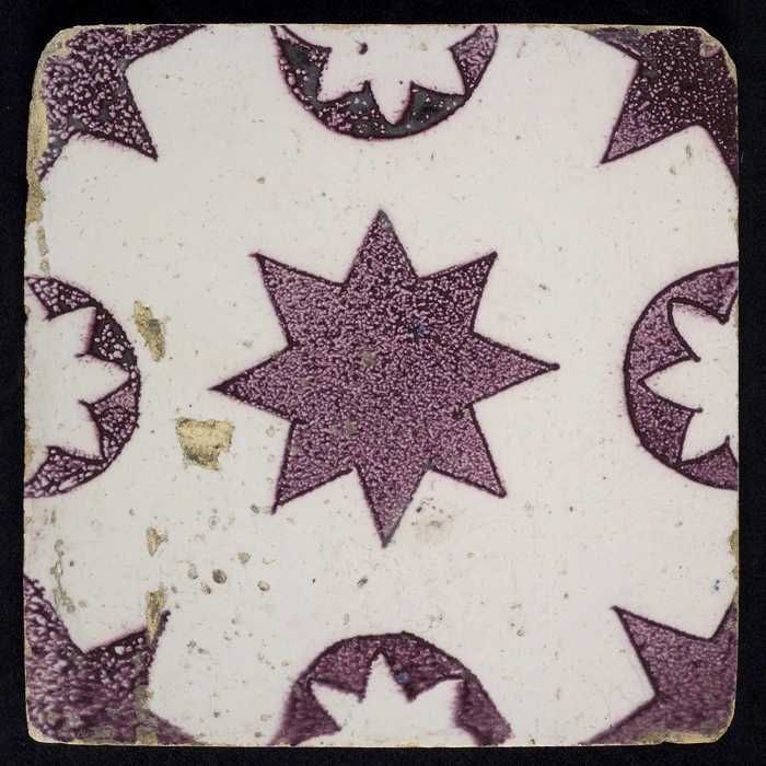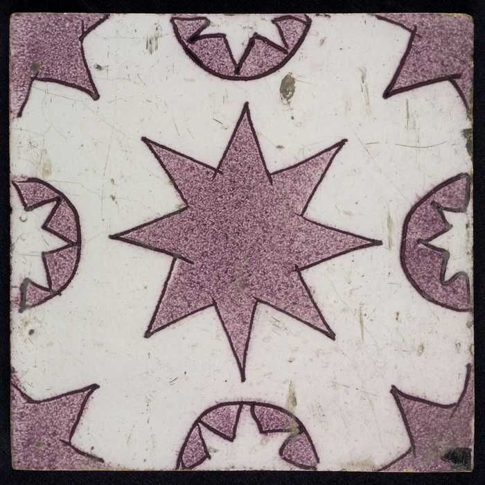 Ornamenttegel, paars op wit, diagonaal decor, gestil...