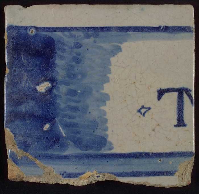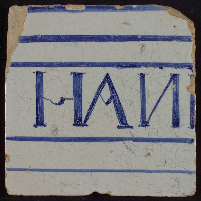 Witte tegel met horizontale blauwe lijnen en "H (?) ...