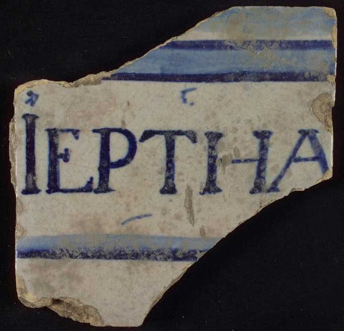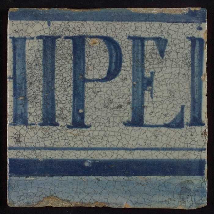 Witte tegel met in blauw "IEPTHA" tussen horizontale...