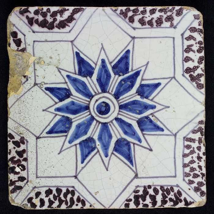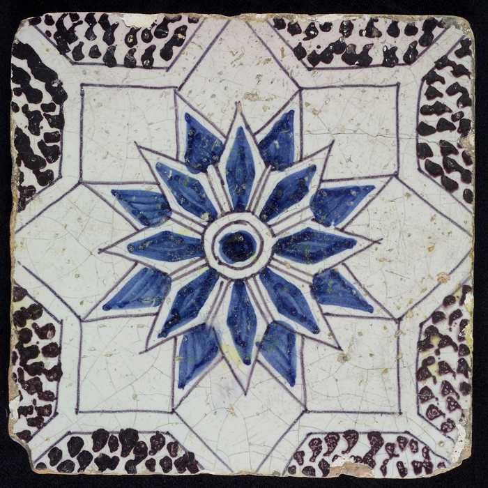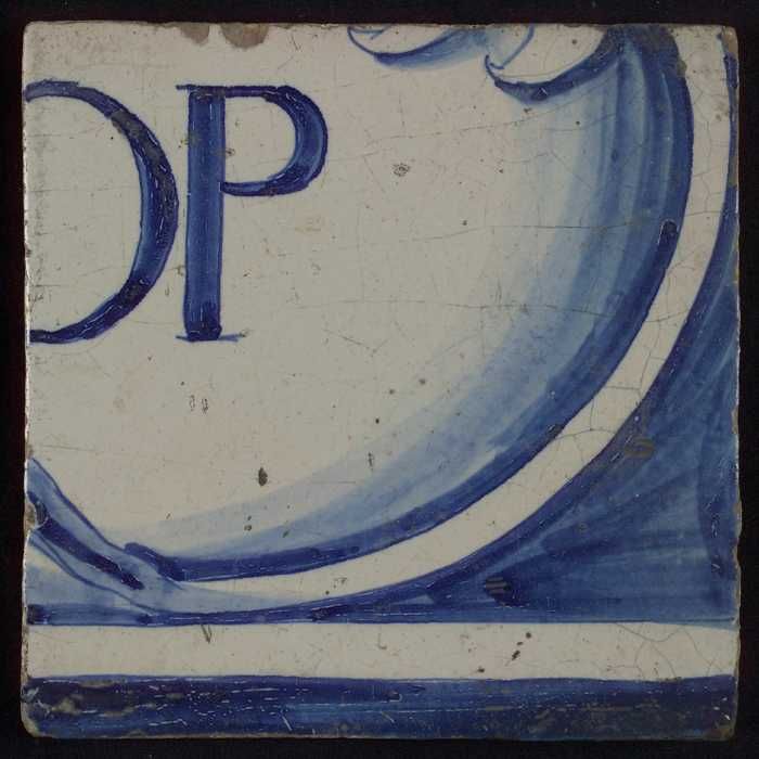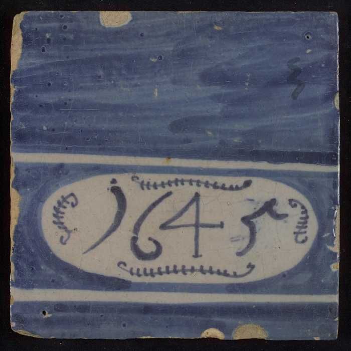 Blauwe tegel met "1645" in wit ovaal, tussen witte h...