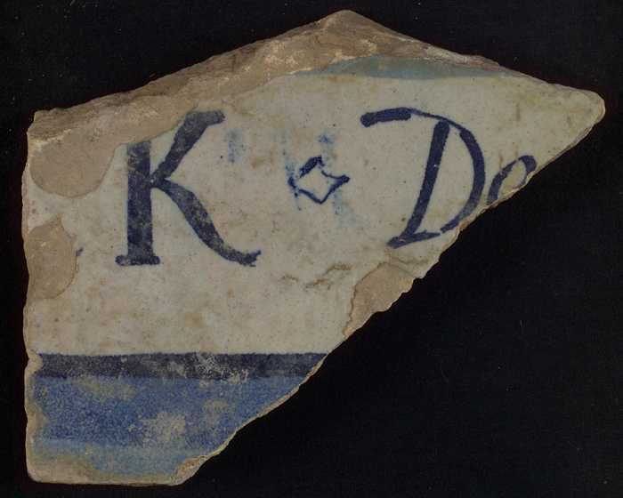 Stuk witte tegel met in blauw letters "K" en "De" en...