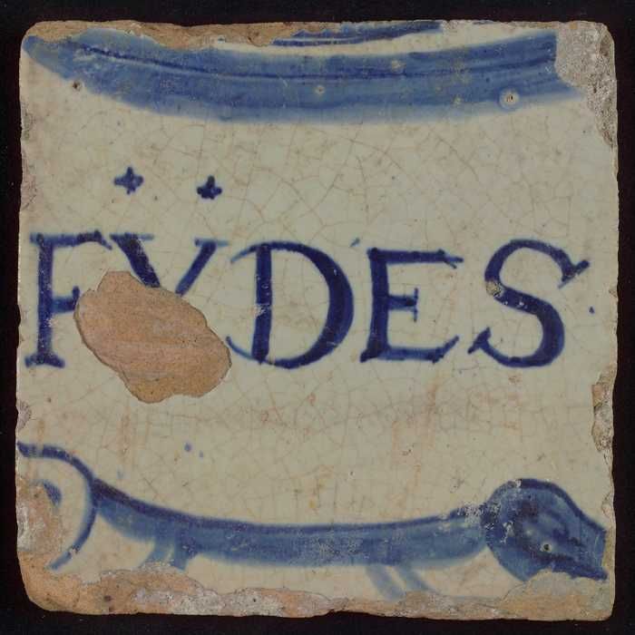 Witte tegel met in blauw "FYDES"