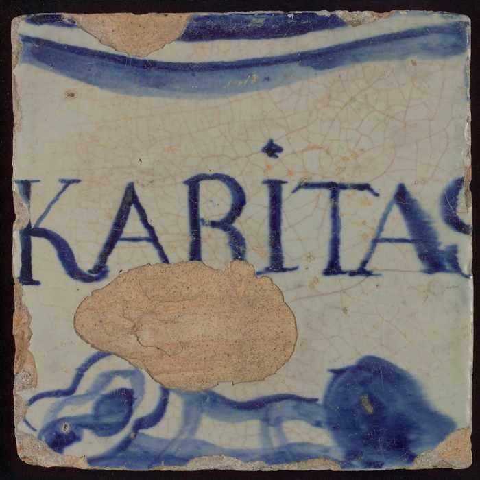 Witte tegel met in blauw "KARITAS"