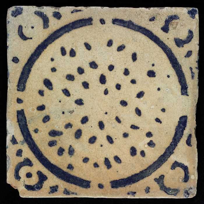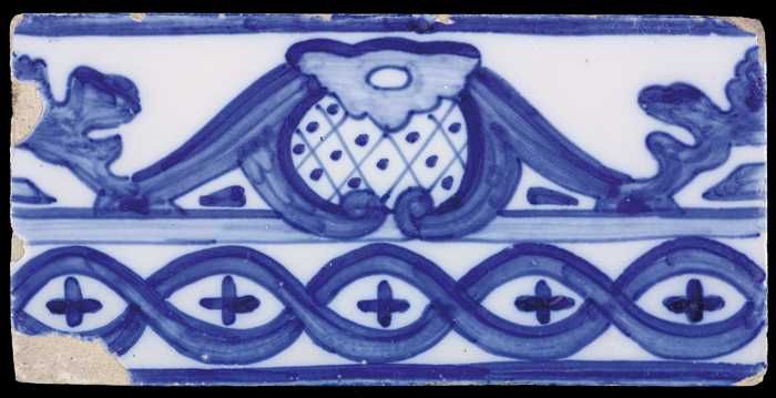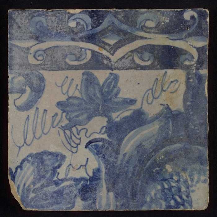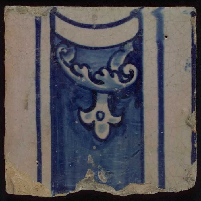 Ornamenttegel, blauw op wit, gesjabloneerd decor van...