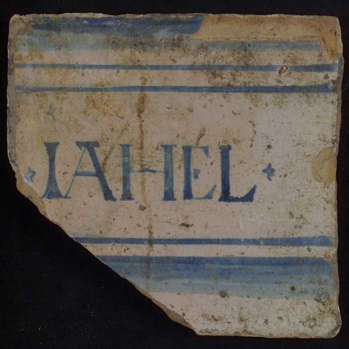 Witte tegel met in blauw "IAHEL" tussen horizontale ...
