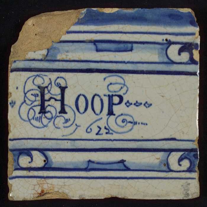 Witte tegel met in blauw "Hoop" en "1622" tussen hor...