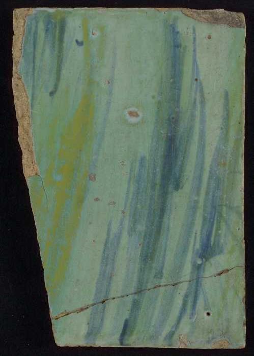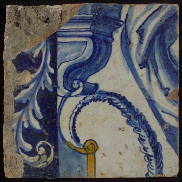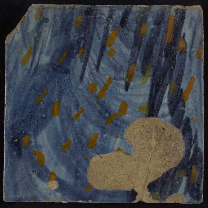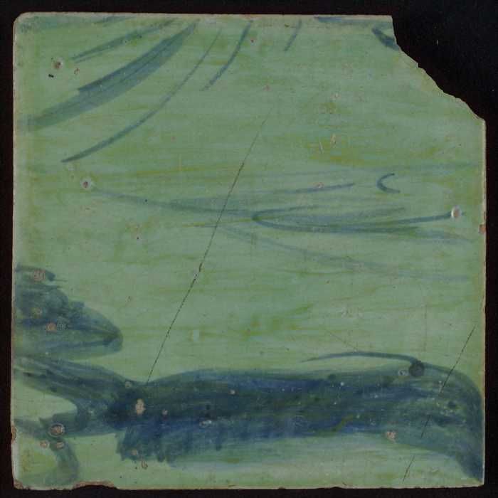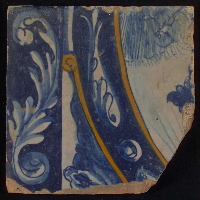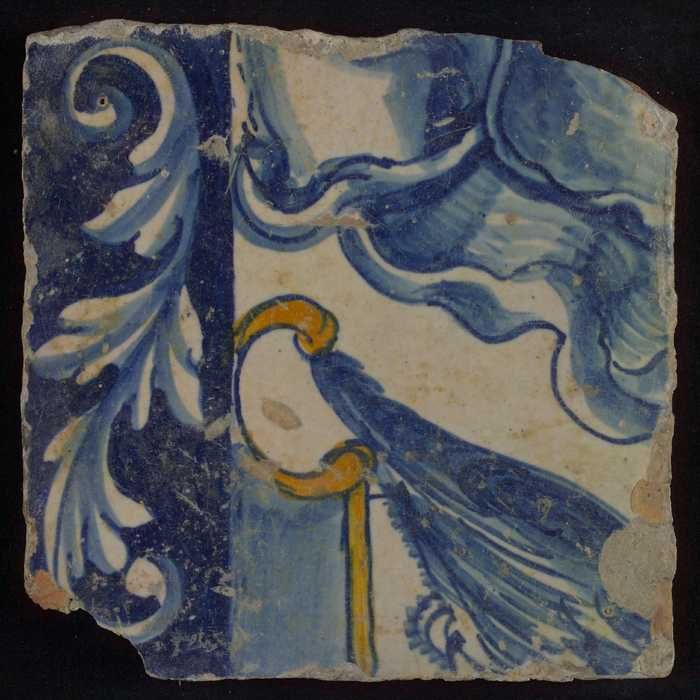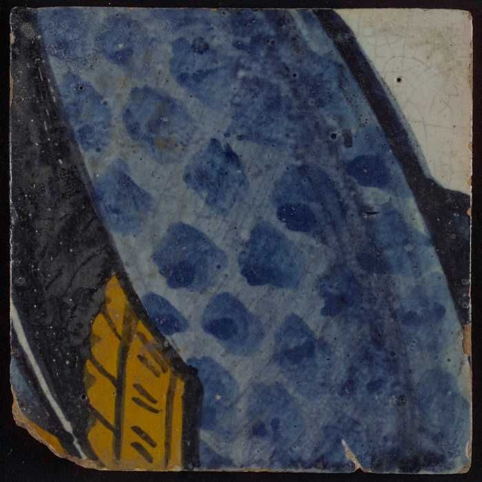 Meerkleurige tegel (blauw, bruin) met deel van leeuw...