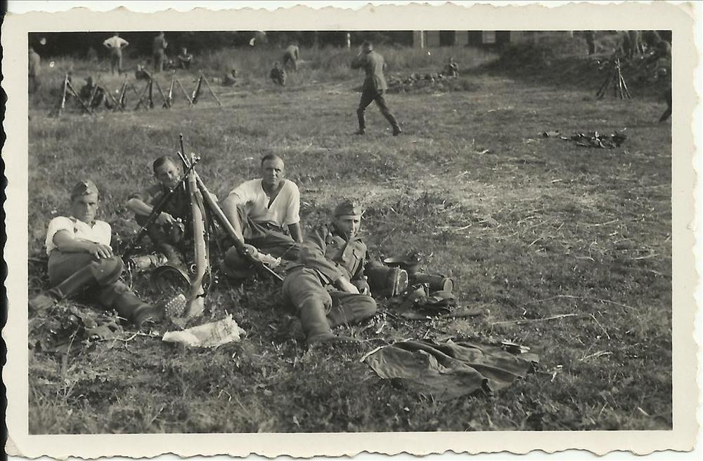 Vier Duitse soldaten zitten in het gras, geweren teg...