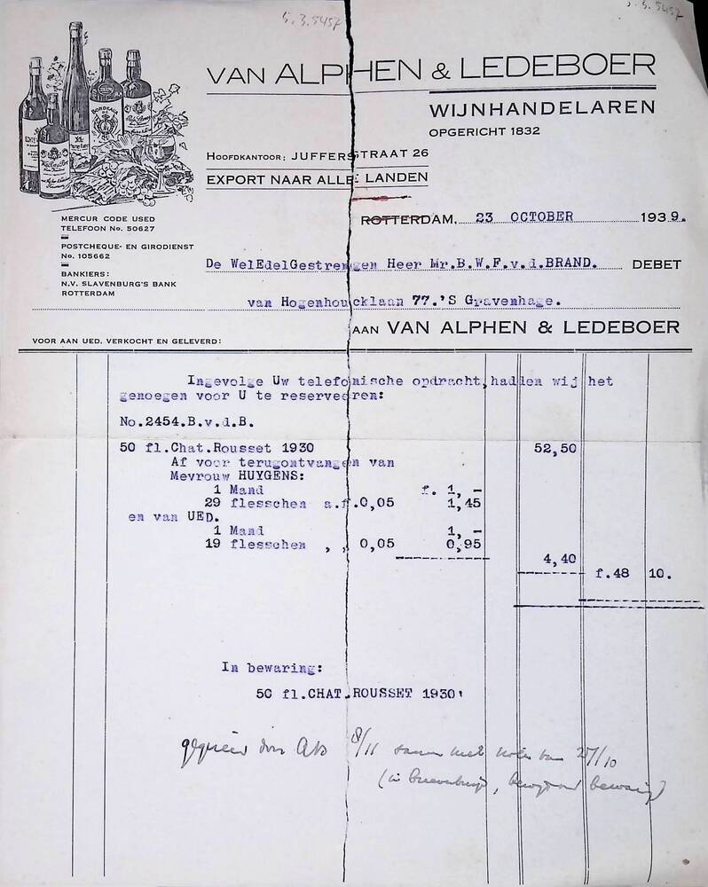 formulier, rekening voor Dhr v.d. Brand, van Hogenho...