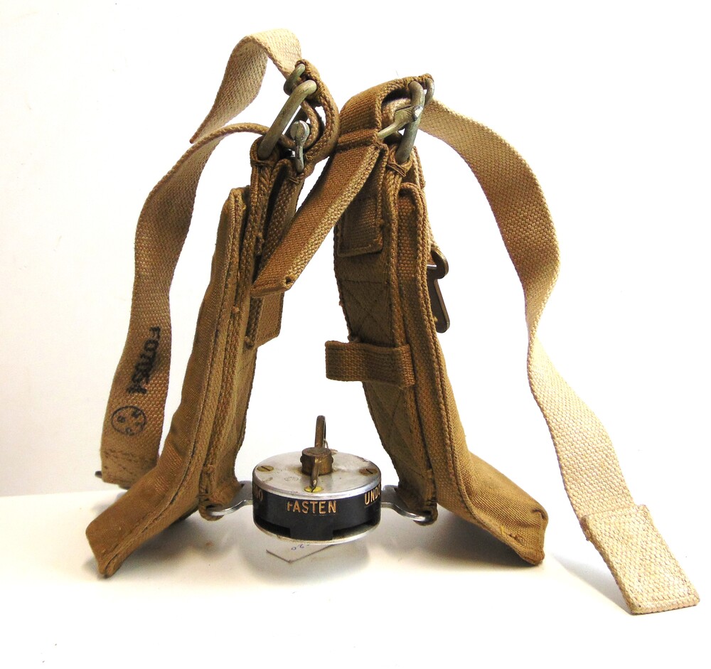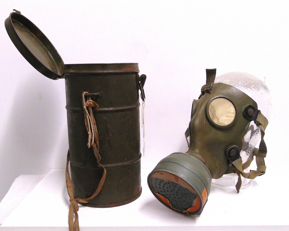 Gasmasker met een filterbus in een blikken bus