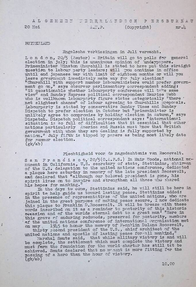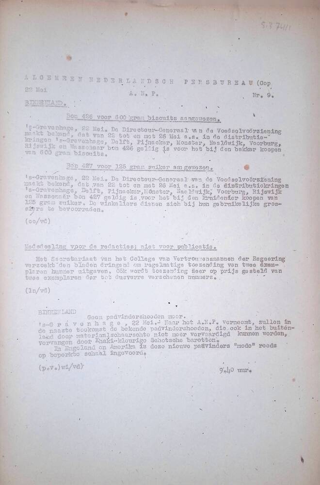 Algemeen Nederlandsch Persbureau, mededelingen, 20 m...