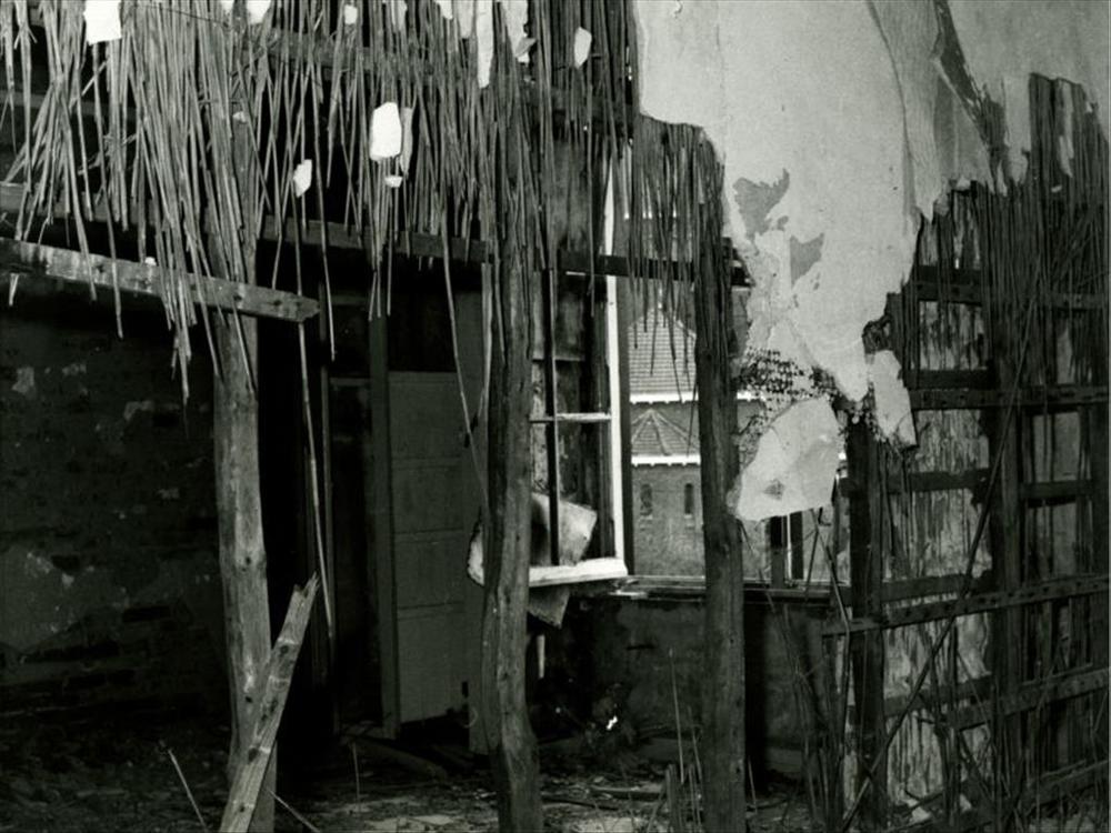 kerkgebouw gezien vanuit ernstig beschadigd gebouw