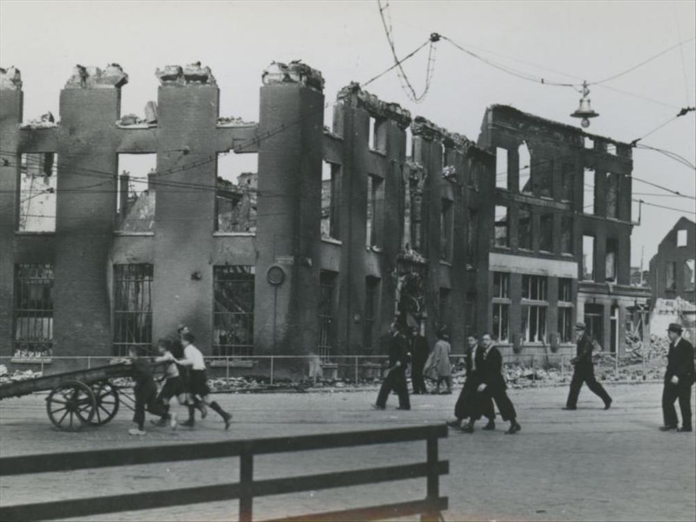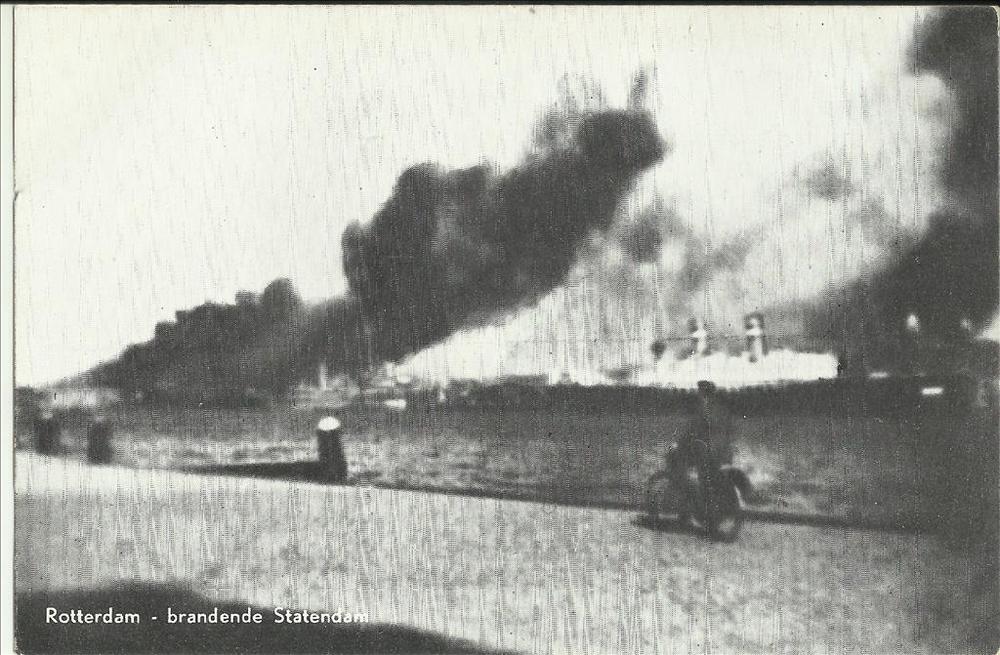Rotterdam , Brandende Statendam na het bombardement ...