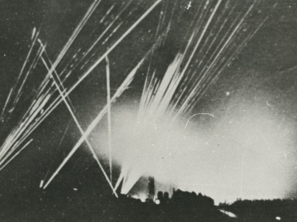 Foto van vuren luchtdoelgeschut boven stad met vuurg...