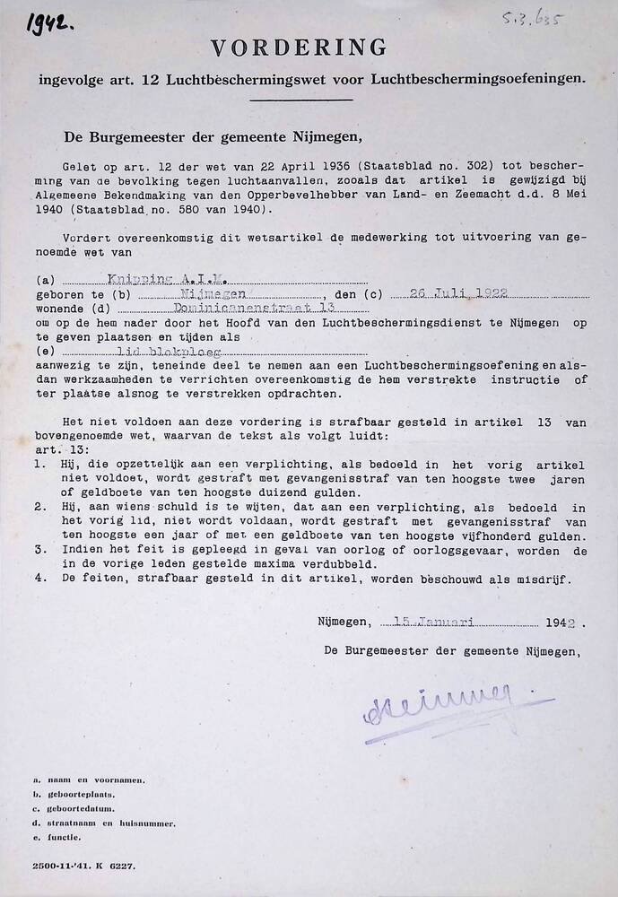 Luchtbeschermingsdienst Nijmegen 1939-1944 Vel met v...
