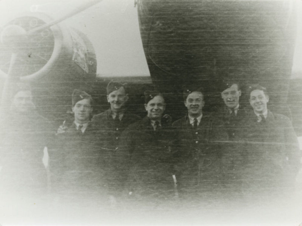 Foto van zeven mannen in R.A.F. uniform onder neus V...