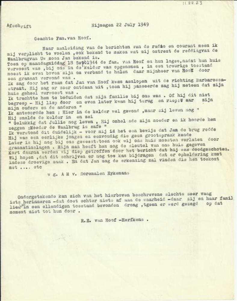 Afschrift, brief R.E. van Hoof-Herfkens, 22 juli 1949